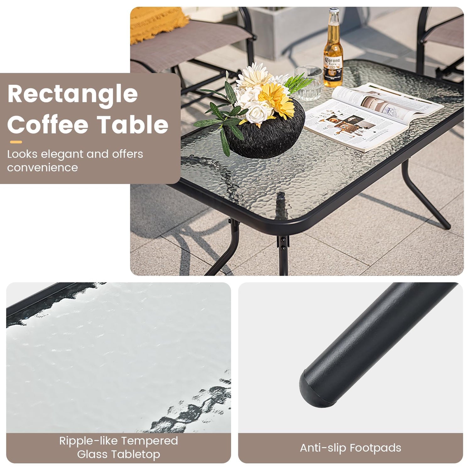 - 【Tempered Glass Coffee Table】The rectangle coffee table is perfect to put snacks, drinks, phones and so on for your convenience. And its ripple-like tempered glass tabletop is elegant and easy to clean.