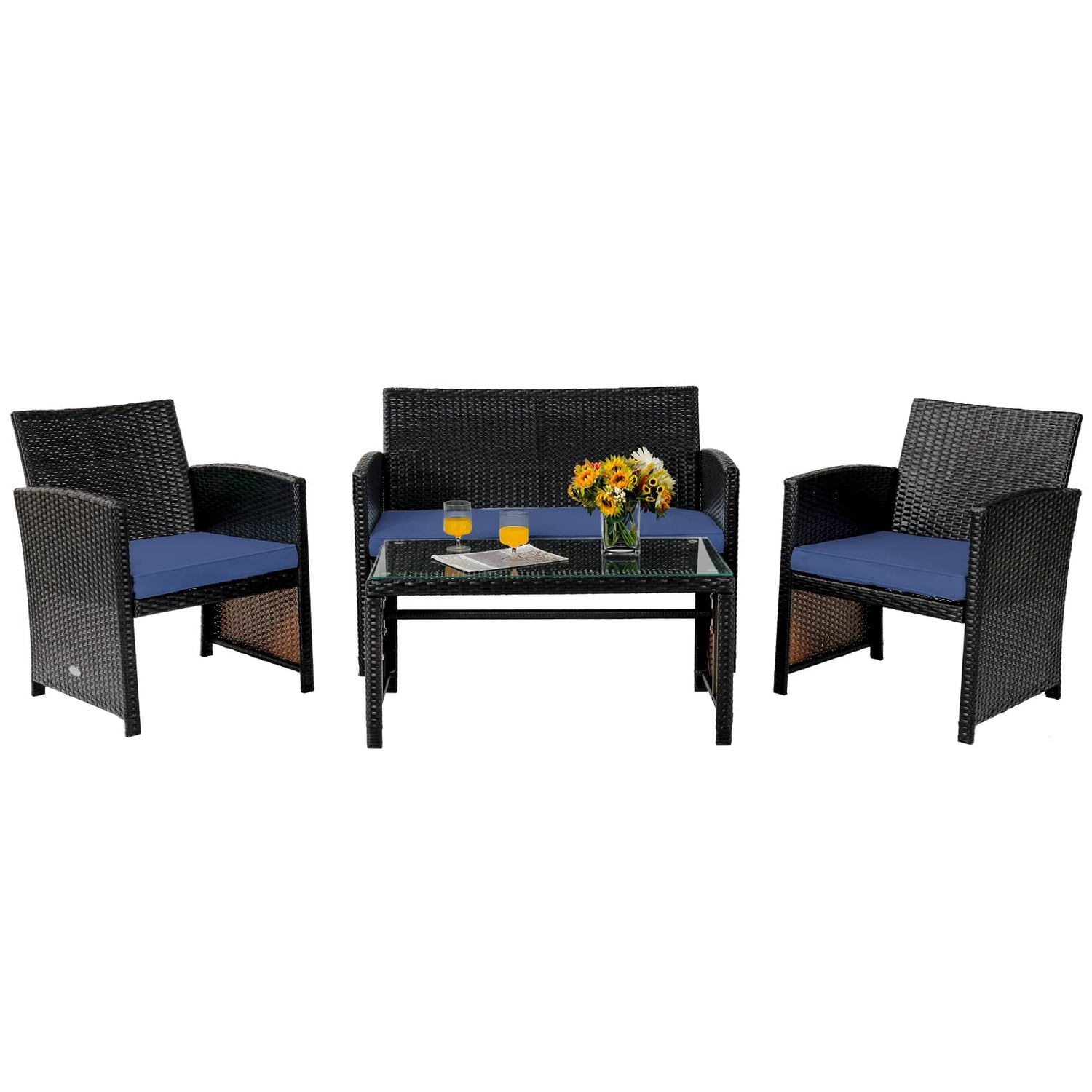 Tangkula 4 Pieces Rattan Furniture Set, Outdoor Conversation Set w/Chair & Loveseat & Tempered Glass Coffee Table, Suitable for Garden, Backyard, Poolside, Patio Furniture Set for 4 (1, Blue)