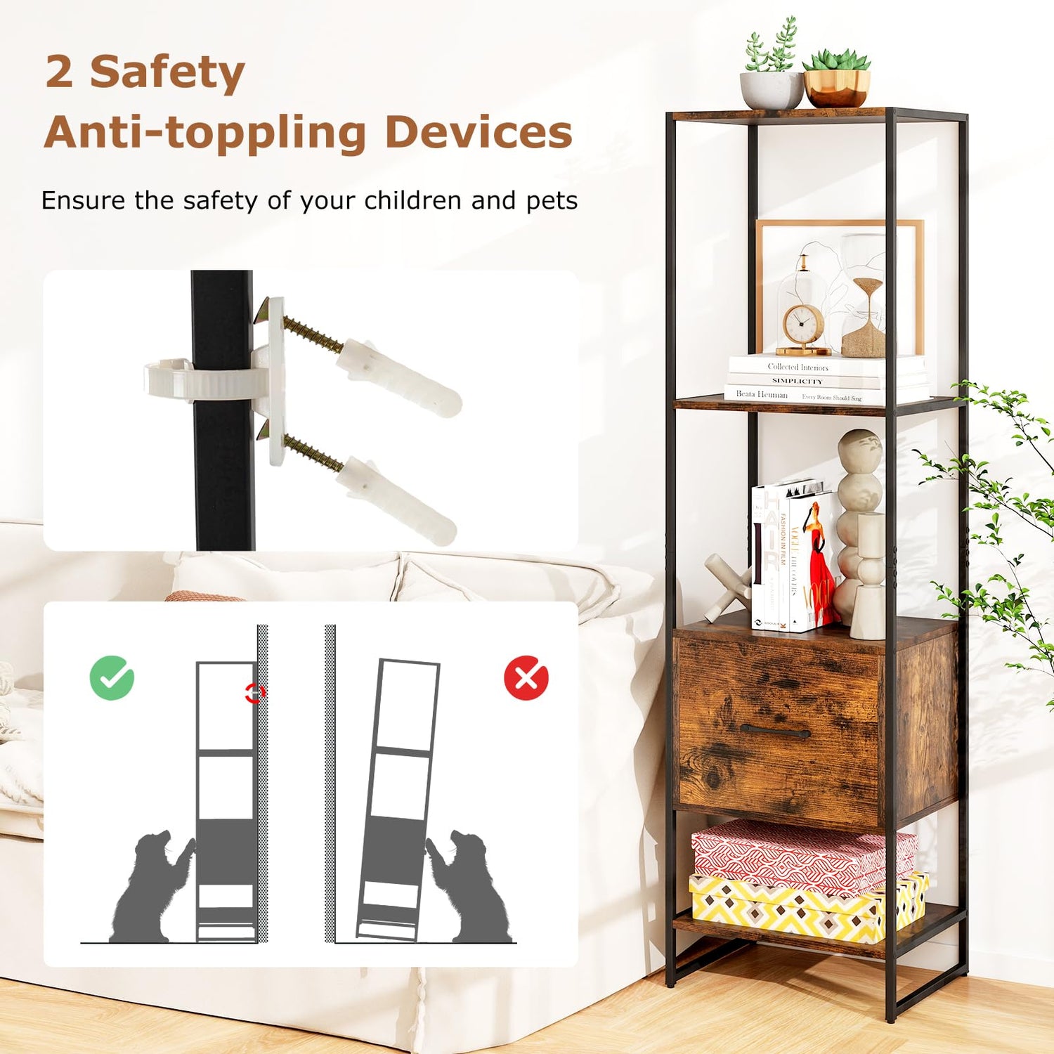 - Safety First: Designed for all families, our slim storage cabinet is equipped with 2 safety anti-toppling devices. These anti-toppling kits help to fix the bookshelf on the wall, which can ensure the safety of your children and pets.