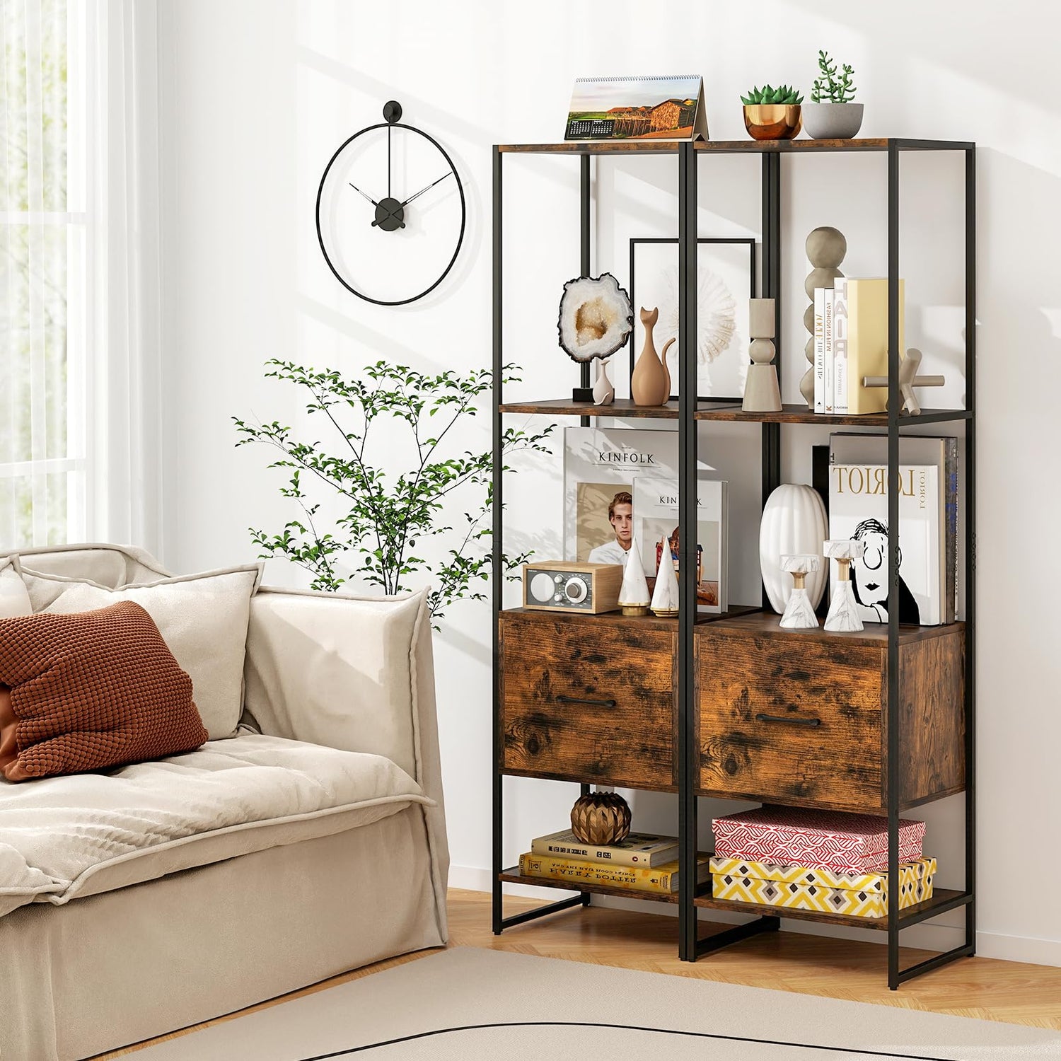 - Meet Your Daily Storage Needs: The slim 5-tier bookshelf features 4 open shelves and a pull-out drawer, offering a practical storage solution for your home. It is perfect for your photo frame, books, decorations and potted plant, making living space organized.