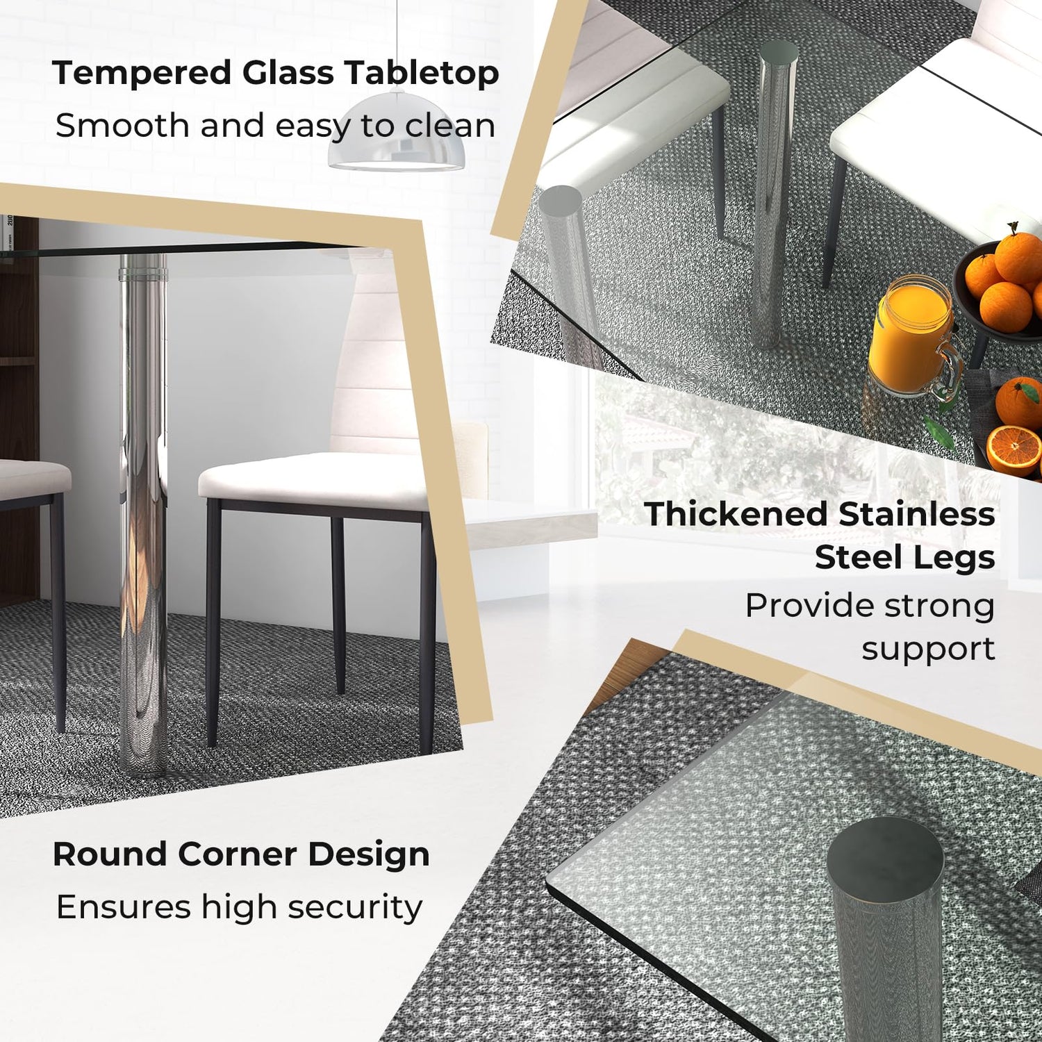 - 【Durable & Stable】The dining table is made of thick stainless steel tube frame and tempered glass table top. The steel frame and glass top are rust-proof and stay like new in years. The cushions of chairs are surrounded by PU leather, which are soft and comfortable.