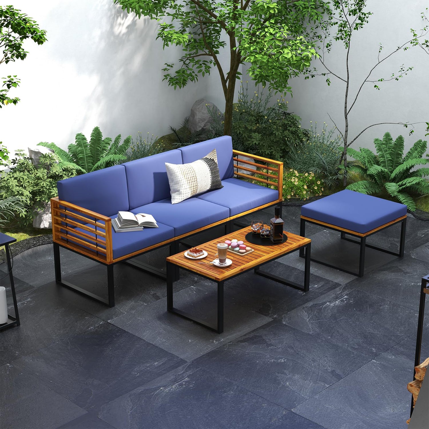 This patio set includes 3 chairs, 1 ottoman and 1 coffee table, allowing you to spend your leisure time with family or friends. The soft and elastic cushions enhance the comfort of the seats, while the easy-to-use zippers on the cushion covers ensure effortless maintenance. Moreover, the coffee table provides ample space for beverages, snacks, and essentials like smartphones. Thanks to the sturdy acacia wood frame and metal support, all 5 pieces are durable and dependable. Lastly, you can rearrange the pieces as needed to achieve the perfect fit for your space.