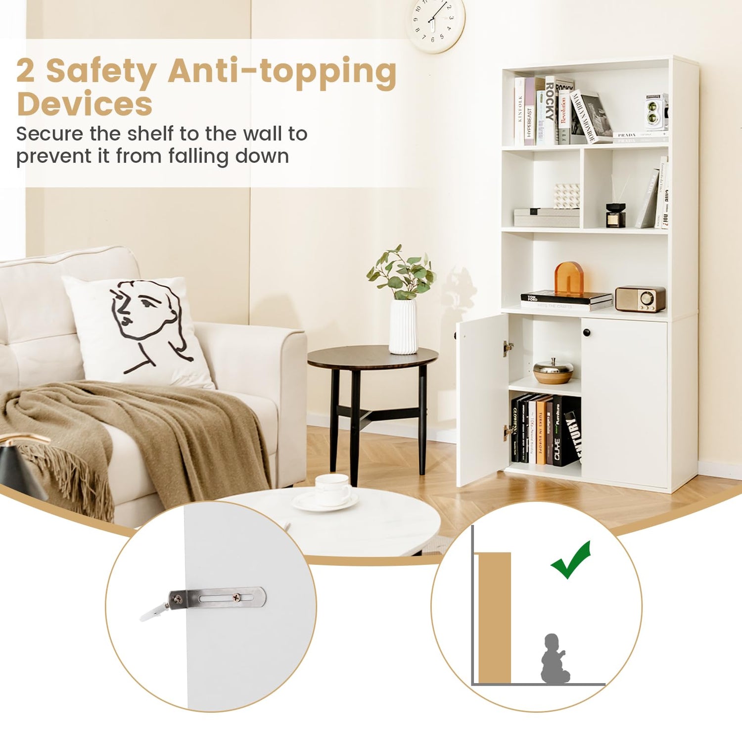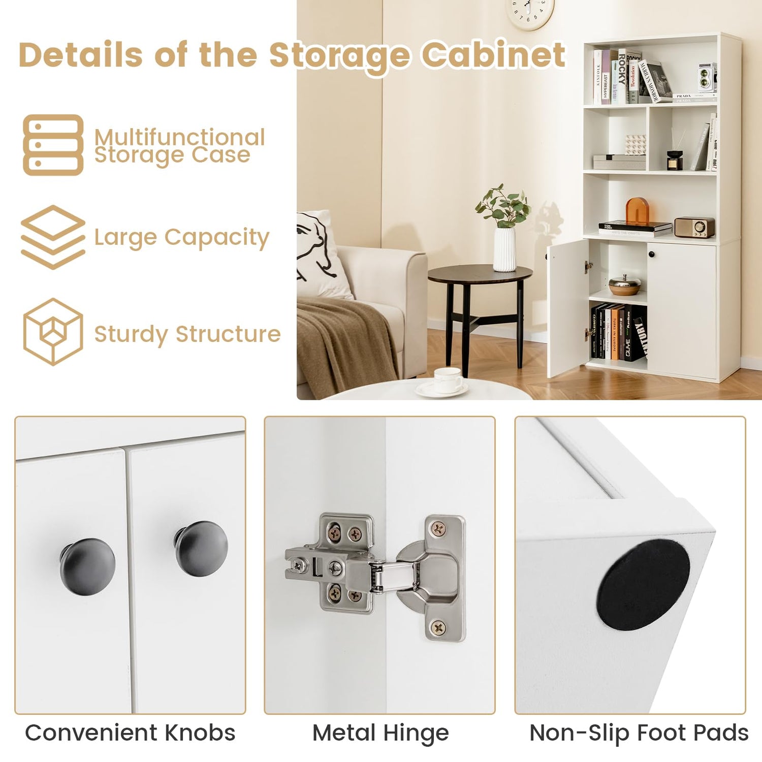 Tangkula 5 Tier Bookcase with 2-Door Cabinet, Tall Freestanding Bookshelf with 4 Open Shelves & 1 Cabinet, Adjustable Shelf, Modern Display Storage Cabinet for Living Room Study (White, 61" H)