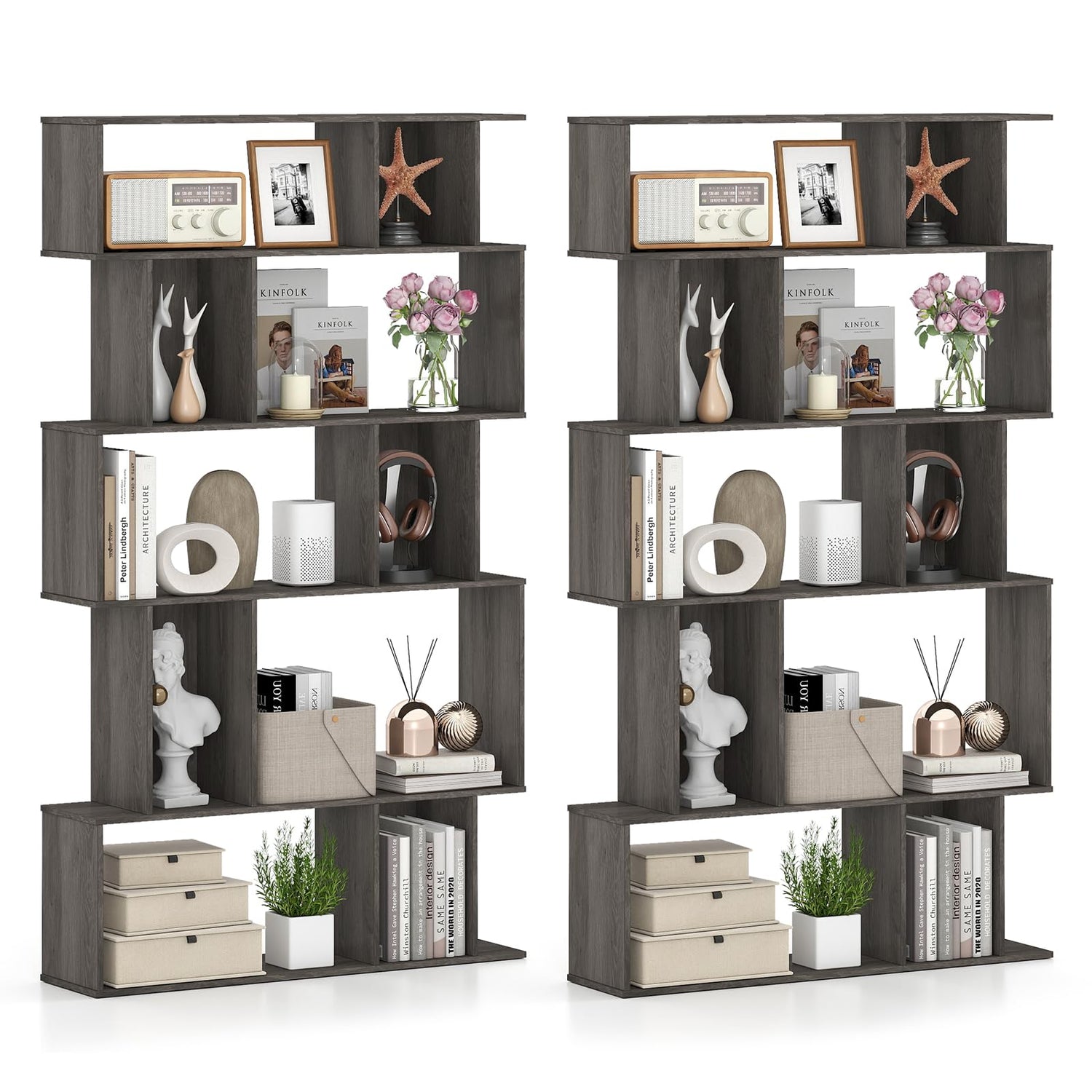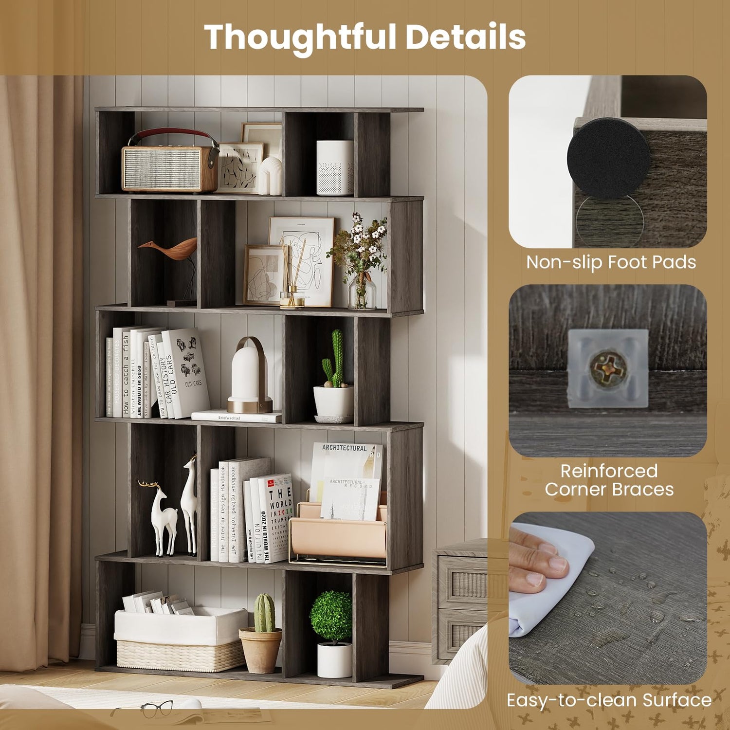 Tangkula 5-Tier Geometric Bookshelf, 62”H Bookcase with Open Shelves & Closed-Back Cubes, S-Shaped Decorative Display Rack Storage Organizer for Living Room Bedroom Home Office (2, Gray Oak)