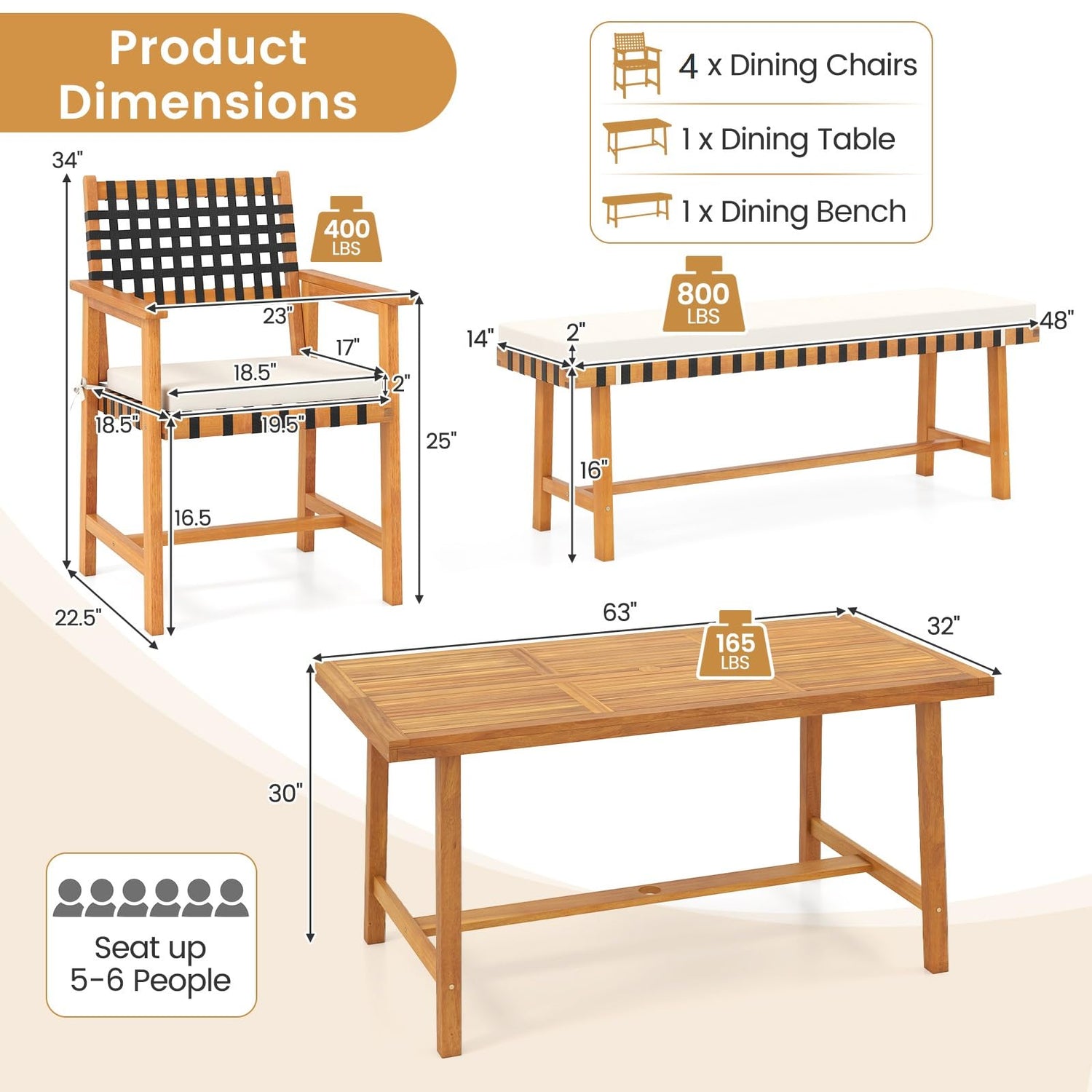 Tangkula 6 Piece Patio Dining Set for 5-6 People, 63” Outdoor Acacia Wood Table with 1.97” Umbrella Hole & Bench & 4 Cushioned Armchairs, for Deck Yard and Poolside