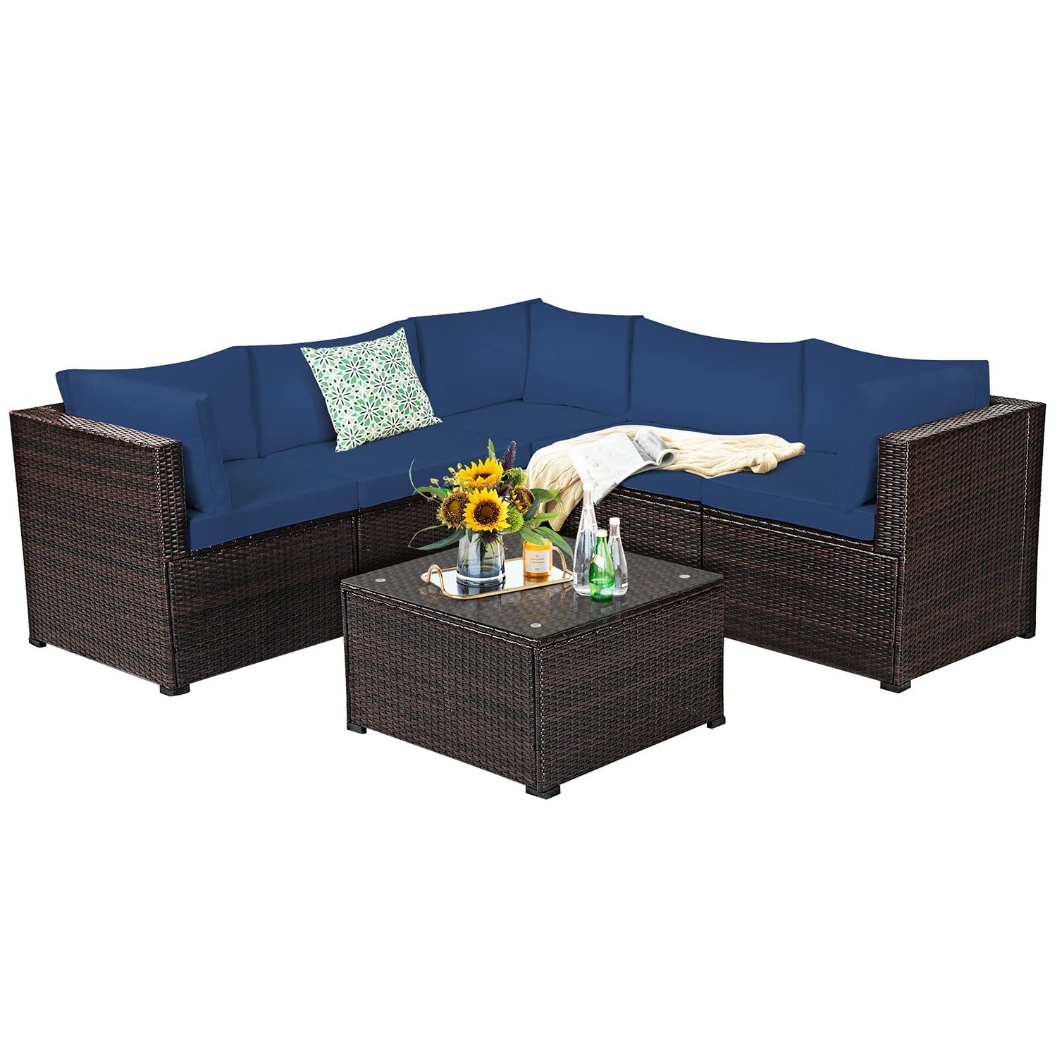 Tangkula 6 Pieces Patio Furniture Set, Outdoor Rattan Sofa Set, Wicker Conversation Set w/Tempered Glass Coffee Table & Cushions, Sectional Sofa Set for Backyard, Garden, Balcony, Poolside