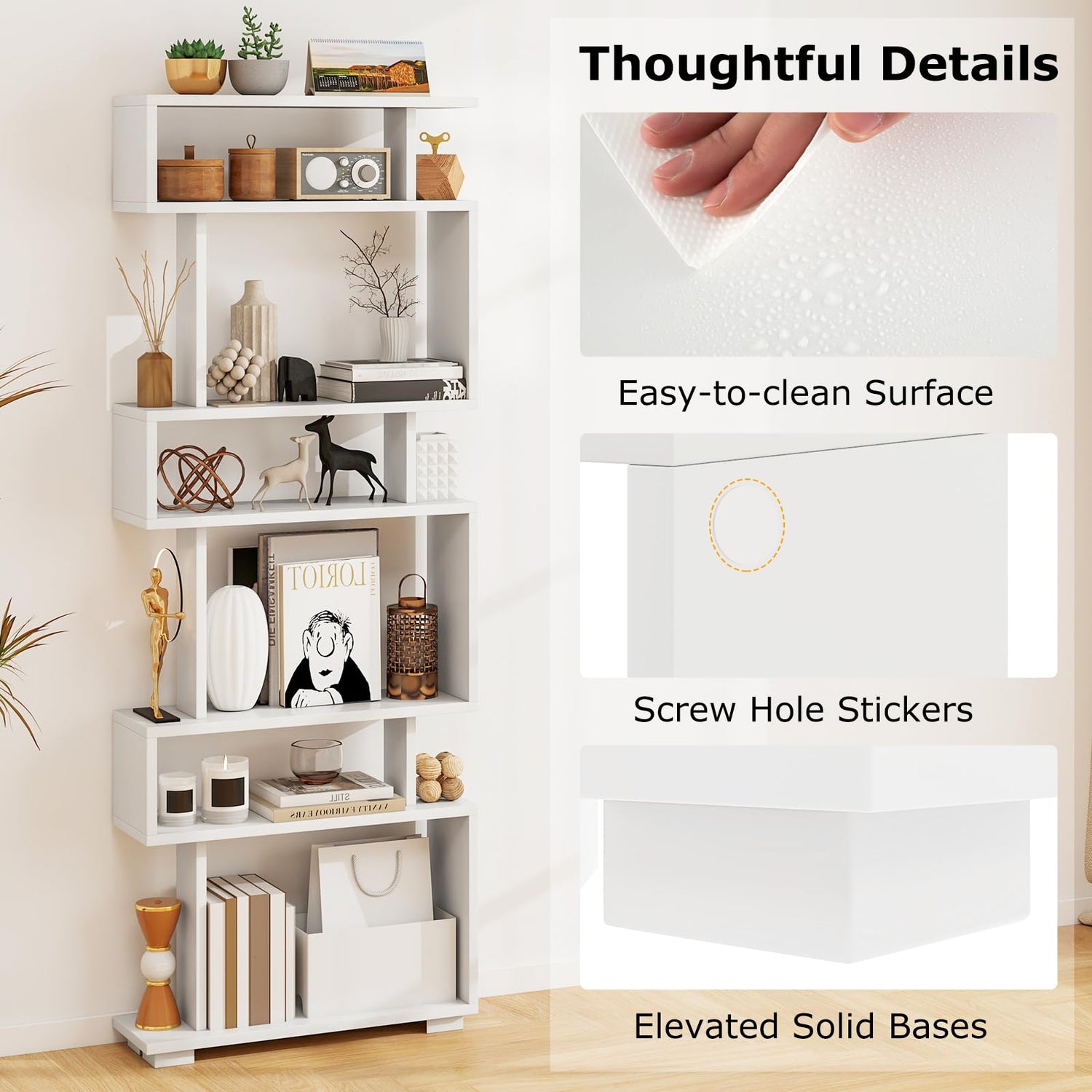 Tangkula 6-Tier S Shaped Bookcase, 64" Tall Modern Geometric Bookshelf with Anti-Tipping Kit, Home Office Freestanding Decorative Storage Display Shelf Room Divider for Living Room Study (2, White)