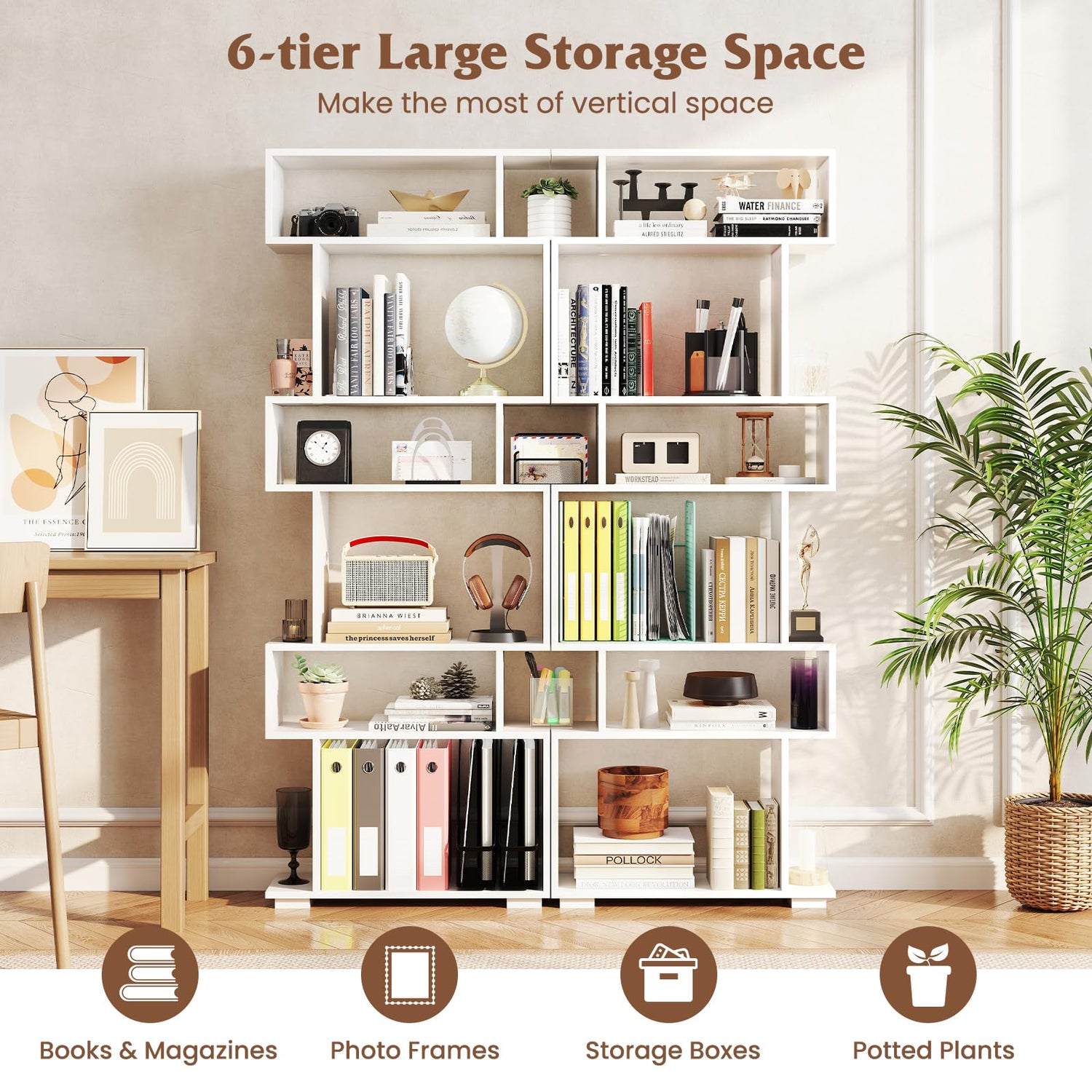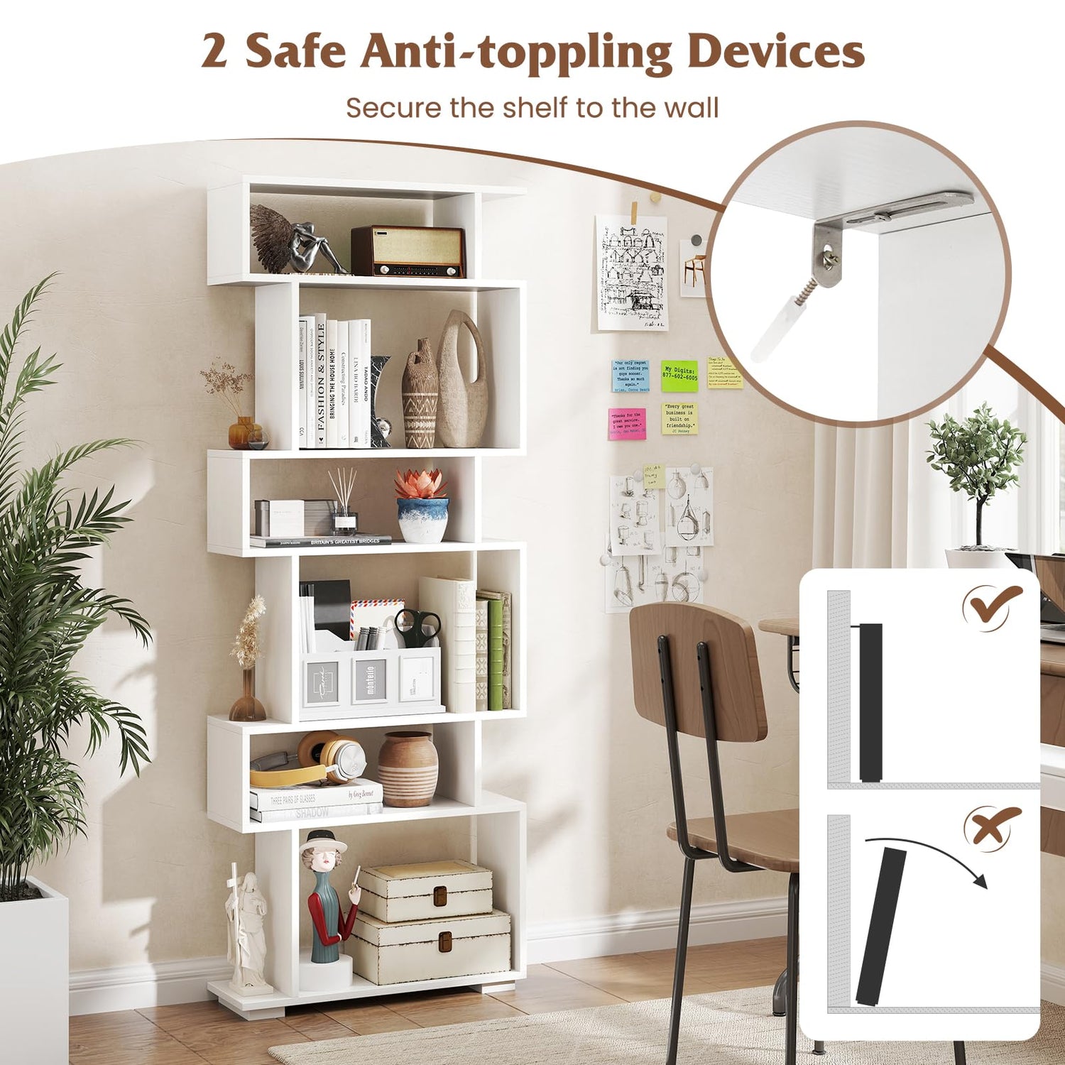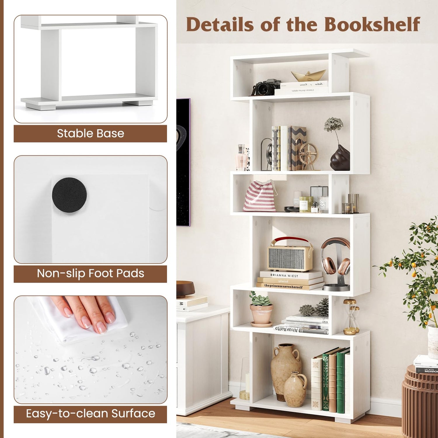Tangkula 6-Tier S-Shaped Bookshelf, 64" Freestanding Geometric Bookcase, Home Office Wood Storage Shelf with Anti-Toppling Device, Room Divider Display Rack for Study, Living Room (1, White)