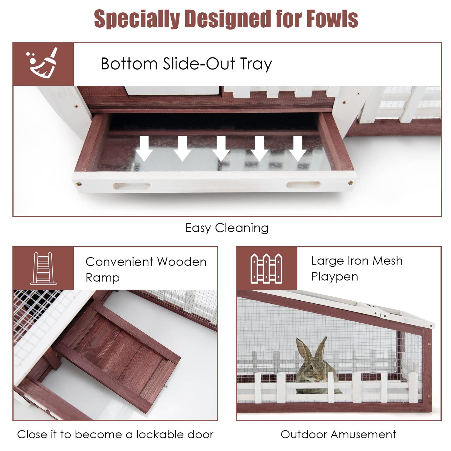- Pet-friendly Design: The rabbit cage is equipped with large iron mesh playpen for outdoor amusement and preventing predators. The running area is accessible by a convenient wooden ramp and you can close it to become a lockable door as well. It also has a bottom slide-out tray for easy cleaning.