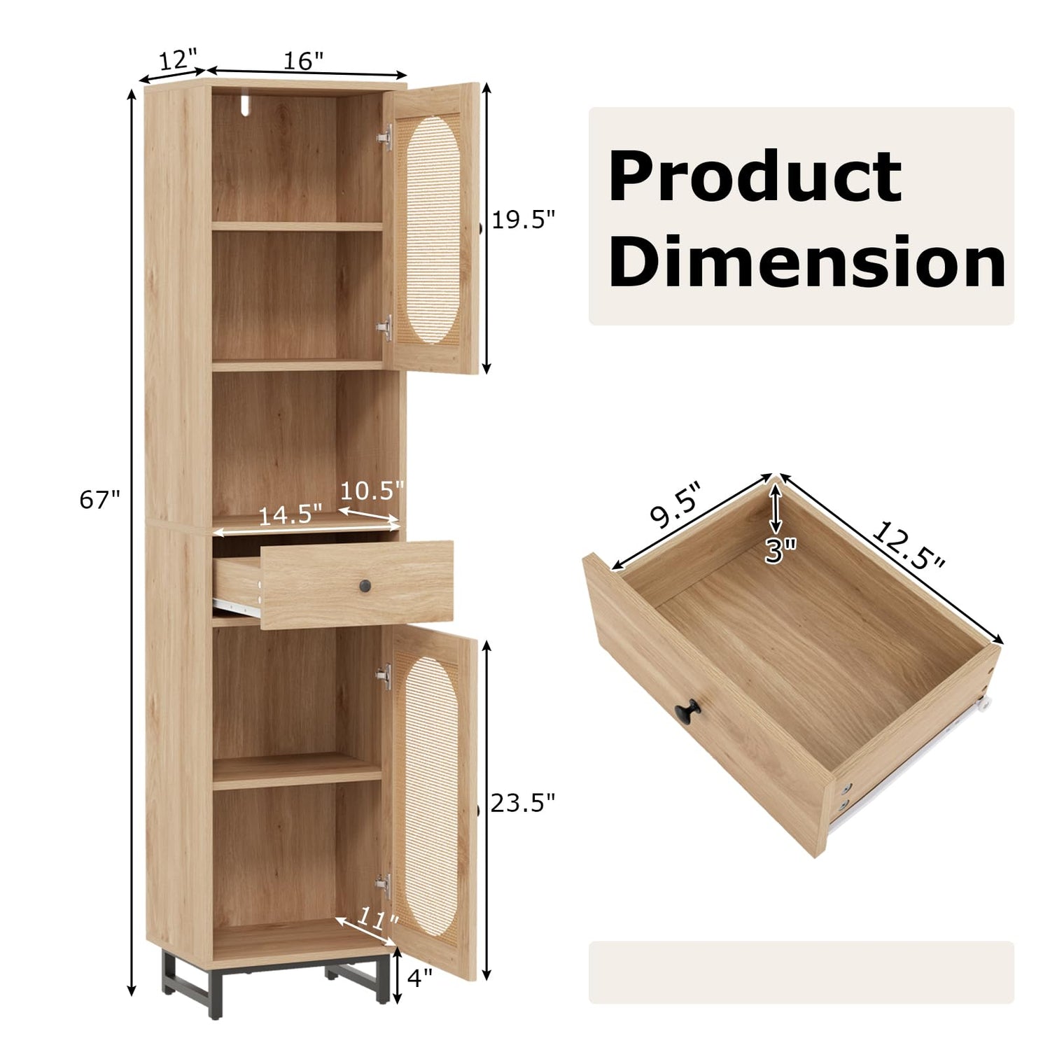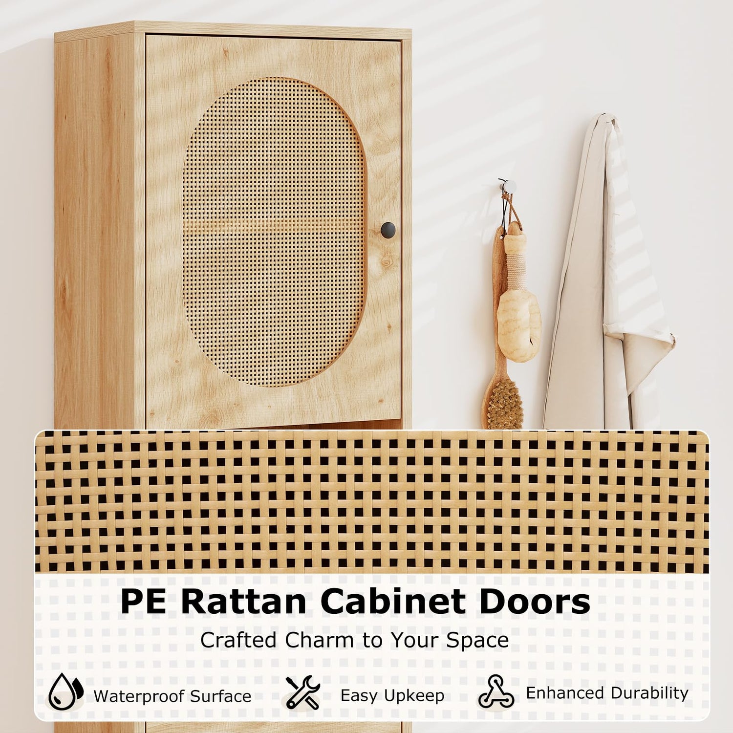 - Timeless Elegance: This tall storage cabinet blends a natural aesthetic with PE rattan cabinet doors that provide waterproof surface to ensure easy upkeep and enhanced durability. This cabinet offers a contemporary appearance that complements any space, such as bathrooms, living rooms, kitchens, etc.