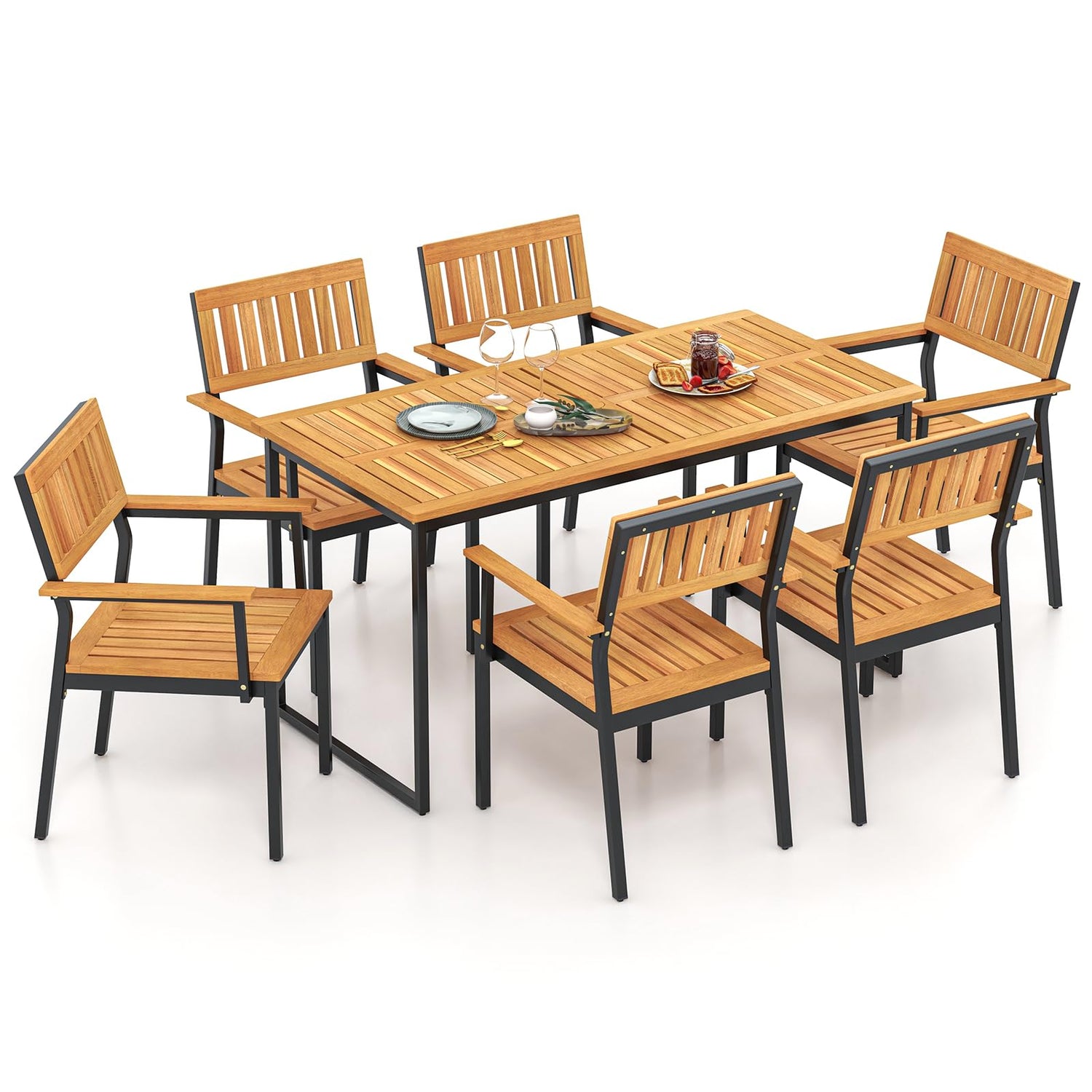 Tangkula 7 Piece Outdoor Dining Set for 6, Acacia Wood Rectangular Dining Table & 6 Armchairs w/Metal Frame, Umbrella Hole, Farmhouse Dining Furniture Set for Garden Porch Poolside Yard