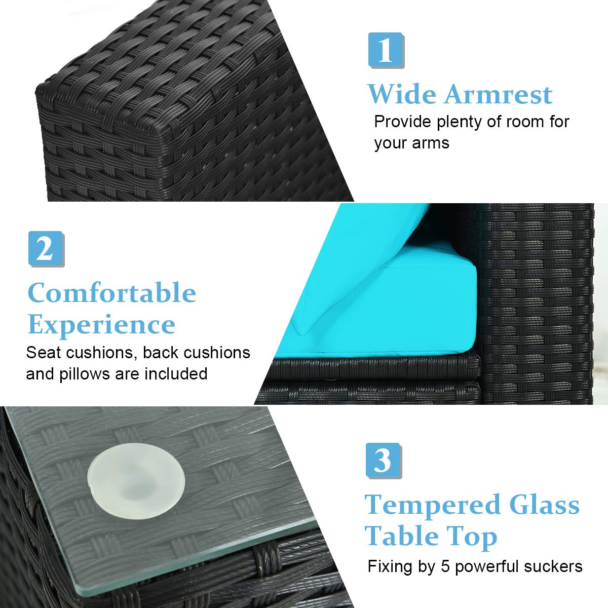 - Modern Style with Coffee Table: Modern wicker furniture set combines outstanding quality and chic appearance, and make it great for your patio, garden, backyard and poolside. Besides, functional coffee table has durable tempered glass top which is fixed by 5 powerful suckers to offer space for drinks and books.