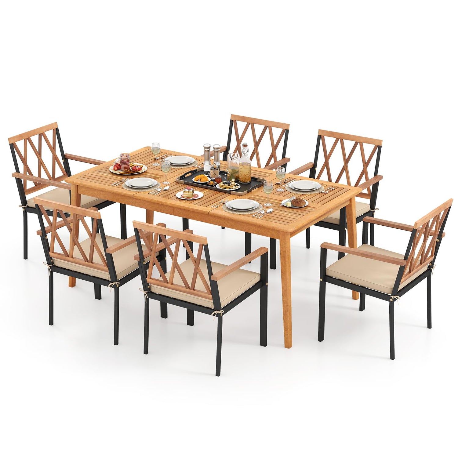 Tangkula 7 Piece Patio Wood Dining Set with Umbrella Hole, Outdoor Rectangle Acacia Table and Cushioned Chairs with Heavy Duty Metal Frame, for Front Porch, Yard, Balcony