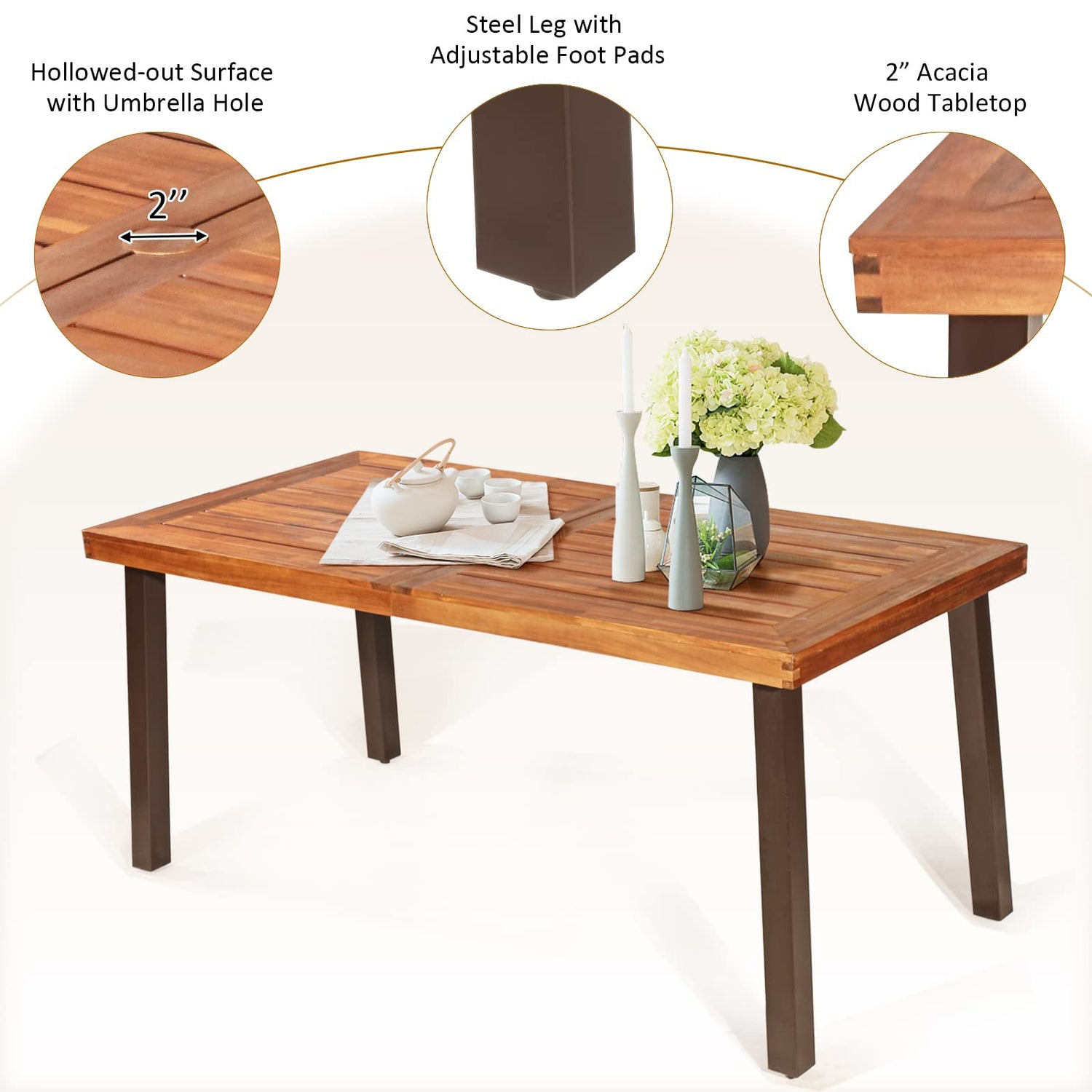 - Umbrella Hole Design for Outdoor Use: The center of the tabletop has a 2.16"umbrella hole, which suits most umbrellas and can bring you a cool leisure time. Combining elegant rattan style with natural wood grain texture, this dining set matches well with any decor and is suitable for the garden, poolside, backyard, etc.