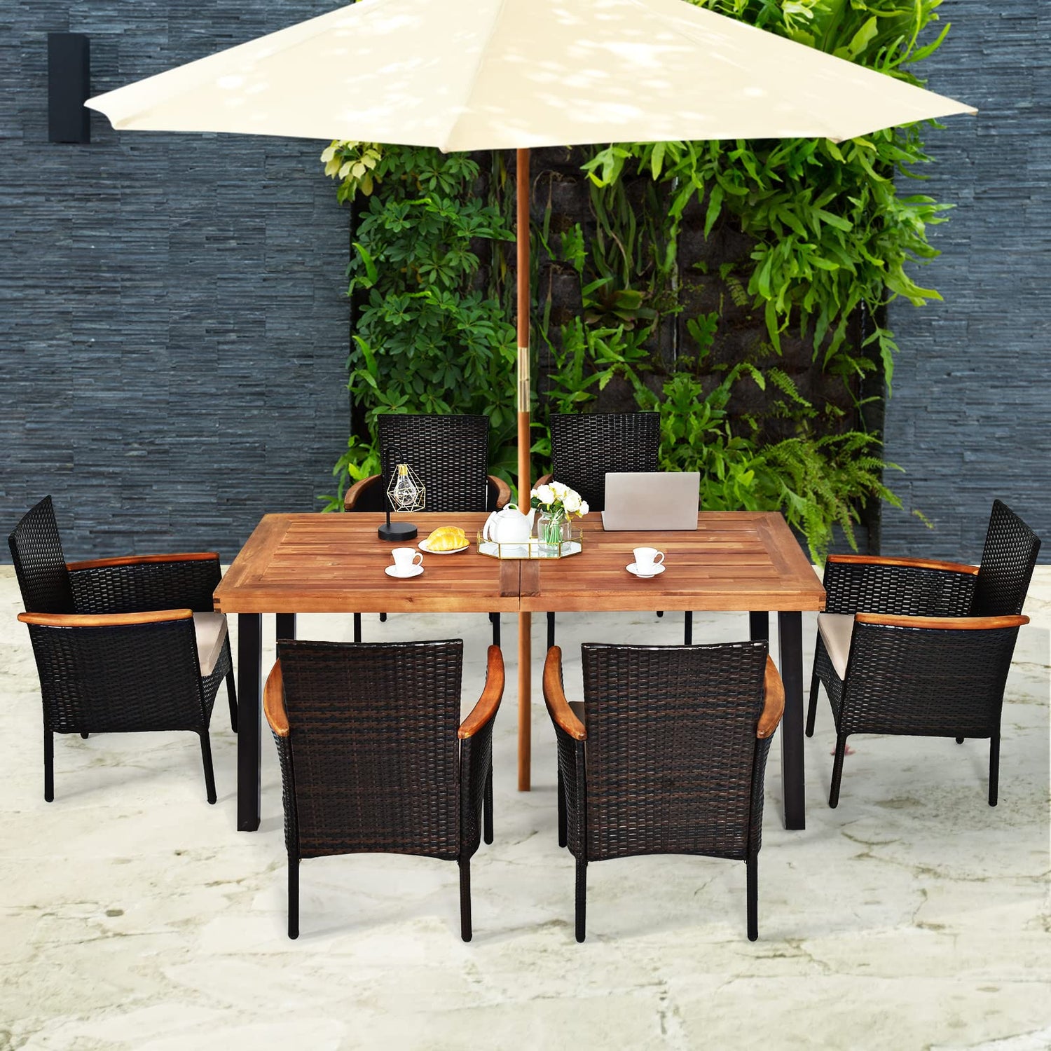 Tangkula 7 Pieces Patio Dining Set, Patiojoy Outdoor Conversation Set w/Acacia Wood Top Table & 6 Stackable Rattan Chairs, Wicker Dining Furniture w/Umbrella Hole, Steel Frame, Sponge Seat Cushions