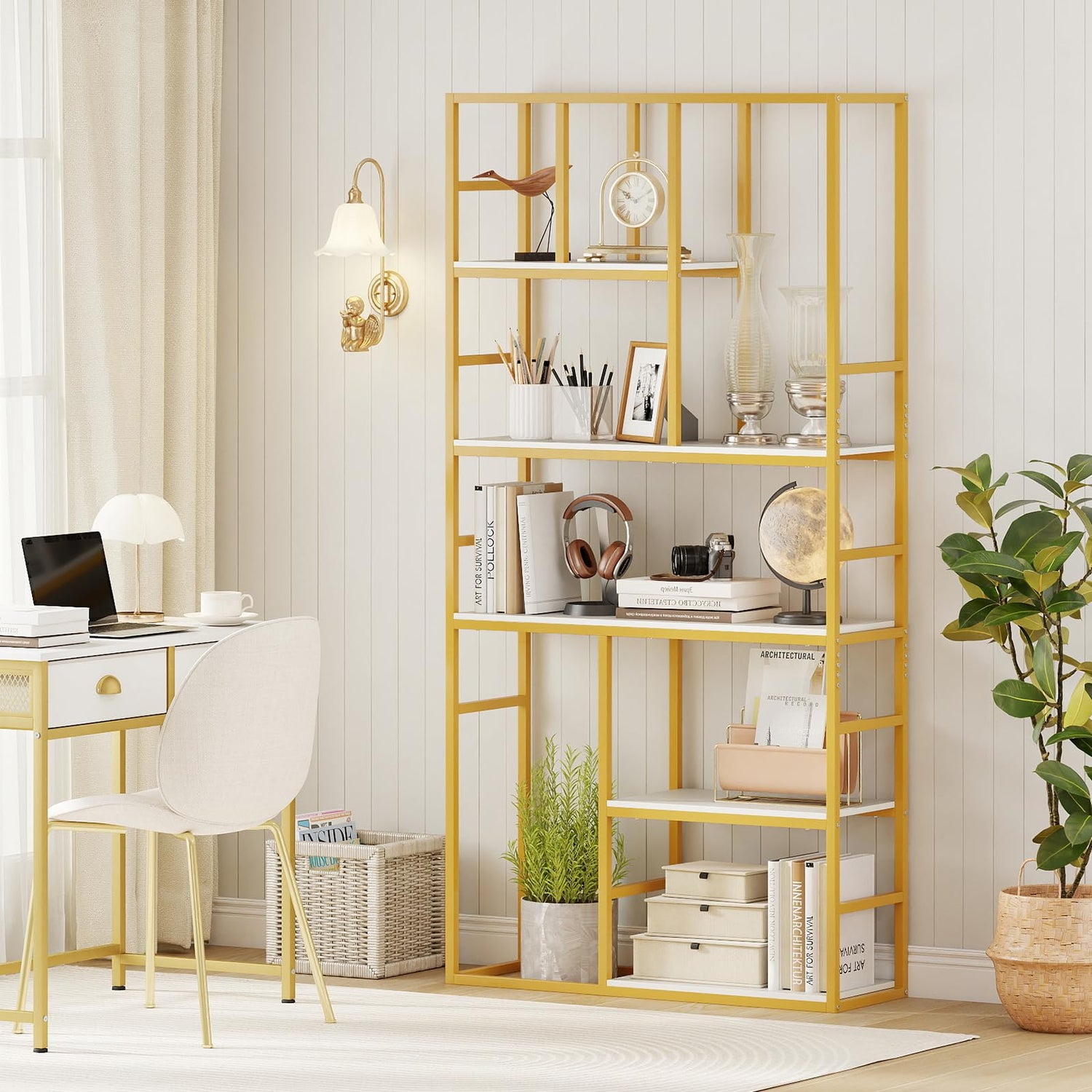 This freestanding bookcase stands 71 inches high and features a white and gold shelving unit that adds a modern touch to your room. Its sturdy metal construction and anti-slip pads provide reliable support and stability, making it both practical and safe. The 5-tier open display shelf allows you to neatly organize and effortlessly access your items, enhancing your living space with a versatile modern storage organizer. Additionally, equipped with 2 anti-toppling devices, this storage organizer ensures enhanced safety while seamlessly fitting into your home office, living room or bedroom.