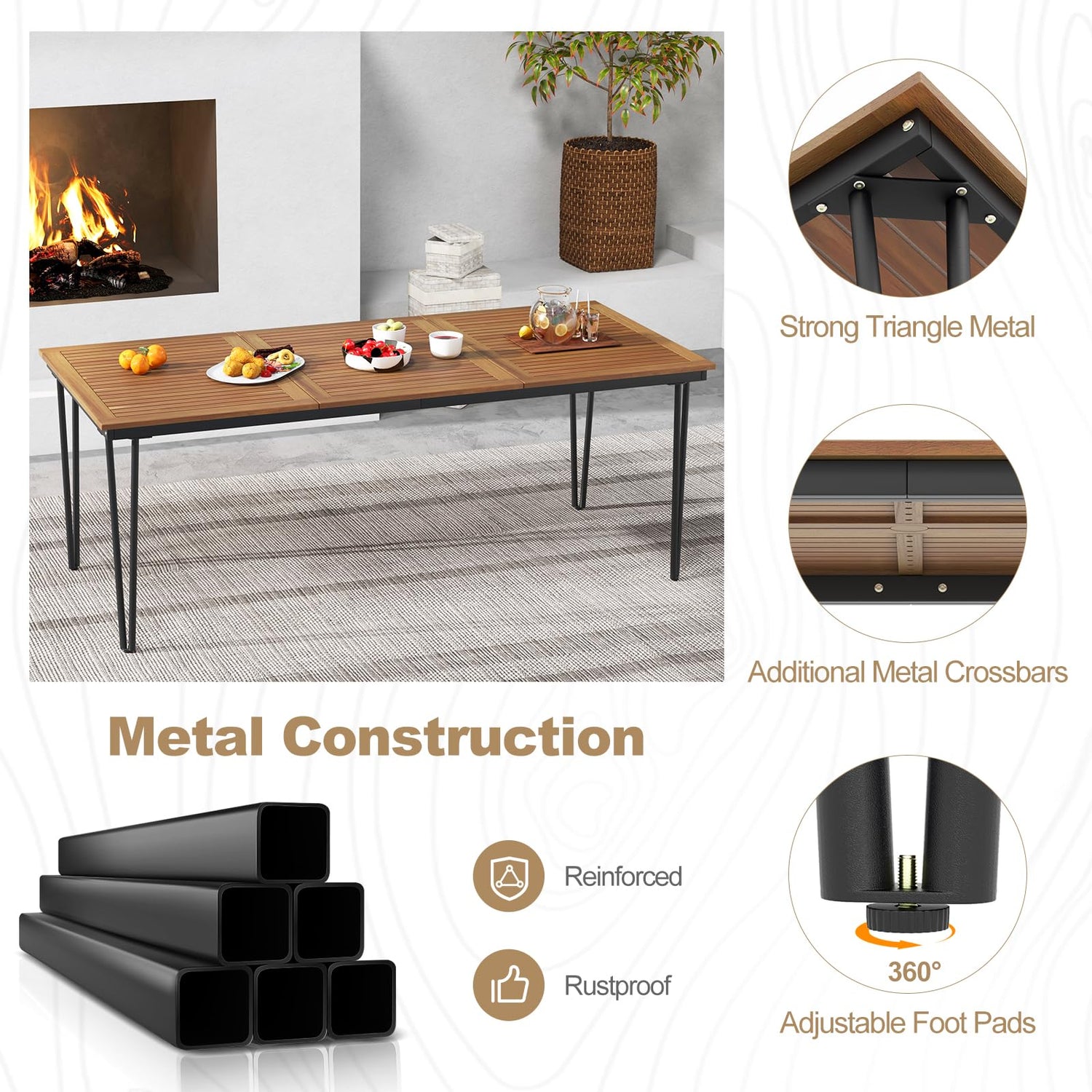 It is perfect for hosting gatherings of up to 8 people while providing a cool shade with its built-in 1.9” umbrella hole. Crafted from durable acacia wood, our dining table features a stylish slatted design that allows rainwater to effortlessly drain during outdoor use. Its robust metal frame, complete with strong legs, metal crossbars, and triangle support, ensures exceptional stability and a weight capacity of up to 165 lbs. Whether placed indoors or outdoors, our patio table remains steady on any surface thanks to its adjustable foot pads. Not only does it offer functionality, but its rustic charm adds a touch of elegance to any space. Assembly is a breeze, and its dimensions of 79”L x 35.5”W x 29.5”H make it the perfect fit for your home.