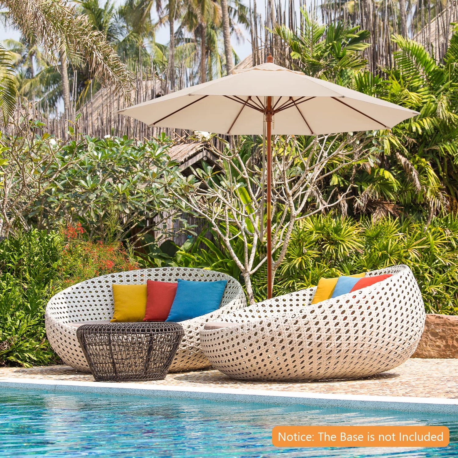 - Notice: The base is not included and this patio umbrella requires a weighted base for adding stability and safety. Also, it can be paired with an outdoor dining table set to enjoy your outdoor dining time with your family or friends (diameter of the wooden pole: 1.5”). In addition, we recommend folding and storing the sun umbrella when not in use for a long time or in extreme weather conditions.
