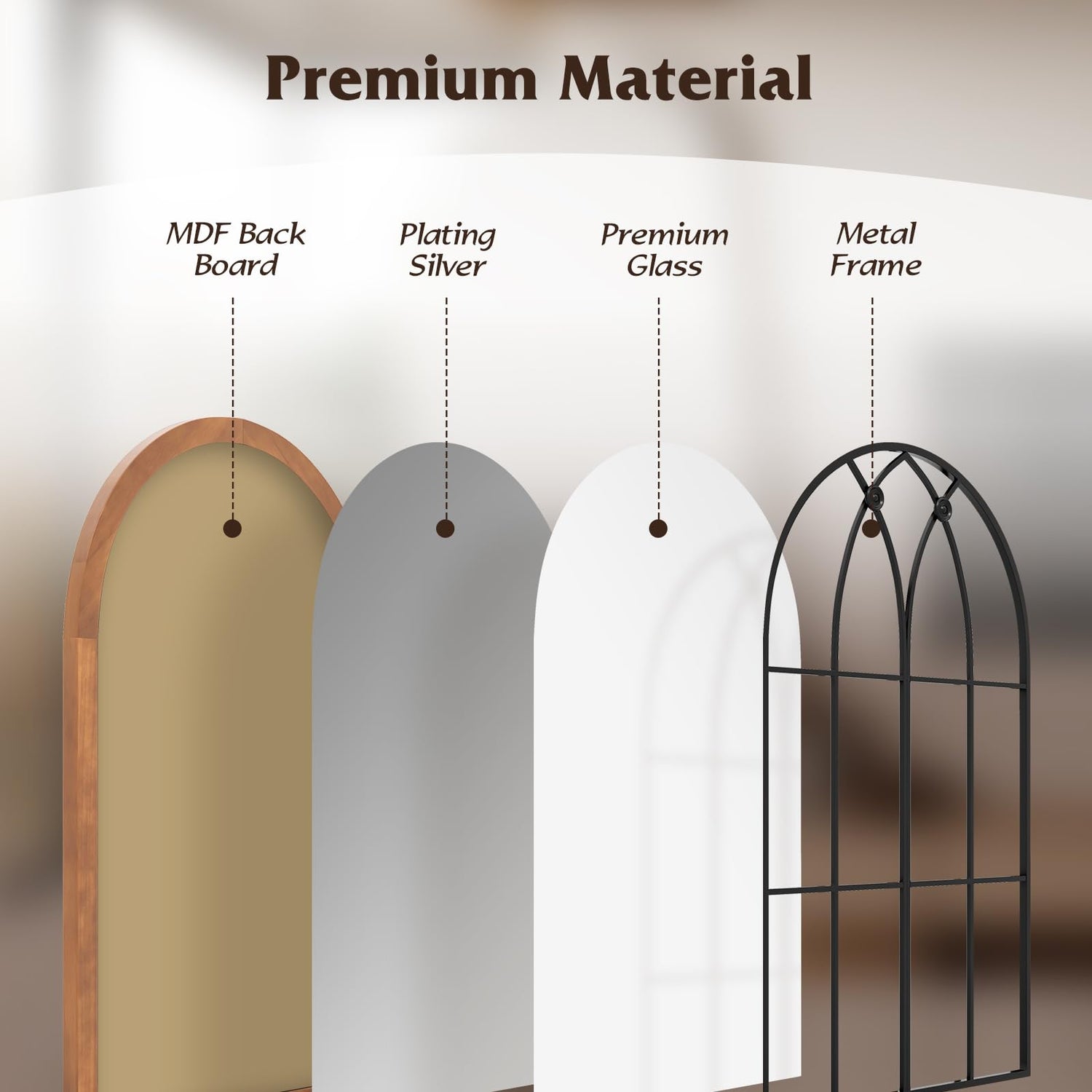 Are you in search of an elegant decorative mirror? Look no further than our arched window mirror! Crafted with a combination of premium cedar wood frame, metal, MDF, and high-quality glass, this mirror not only possesses visual appeal but also guarantees long-lasting durability. Meanwhile, its versatile design makes it a perfect addition to any room for example, living room, bedroom, or bathroom. Besides, the elegant arch frame adds a touch of sophistication and enhances the overall aesthetic of the whole room decoration. Furthermore, our mirror features top-grade glass that ensures a crystal-clear reflection, allowing you to see yourself in exquisite detail. Additionally, it is shockproof and designed for easy maintenance, making it a practical choice for everyday use. Last but not least, the backboard enhances the mirror's overall stability and durability. Don't miss out on the opportunity to elevate your home décor with our exceptional Decorative Mirror!