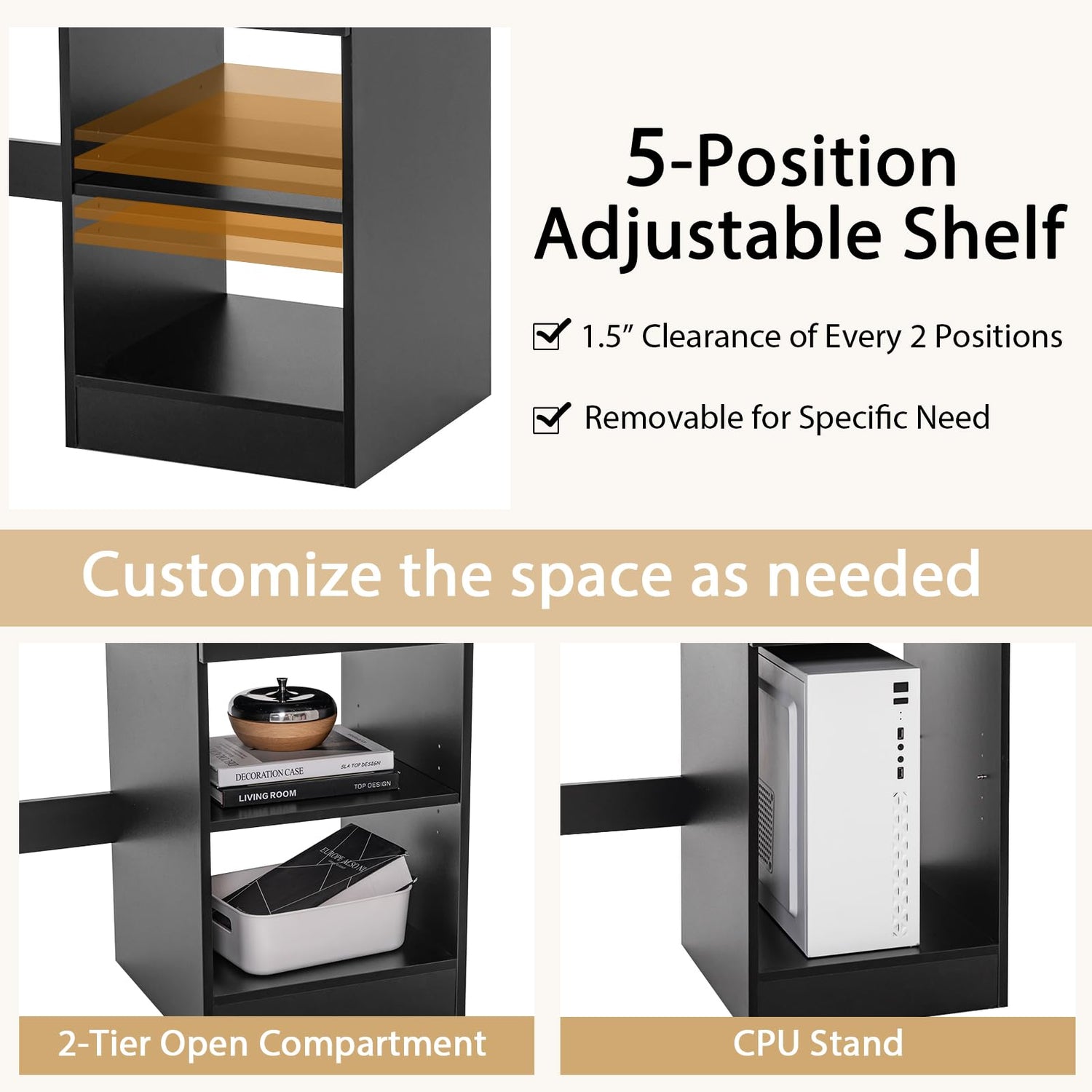 - Practical Adjustable & Removable Shelf: The adjustable shelf is also a genius design. It can be adjusted to 5 positions and there is 1.5” between every 2 positions. Therefore, you can customize the space according to your needs. Moreover, the shelf can be removed, which allows you to make the bottom shelf a CPU stand for convenience.