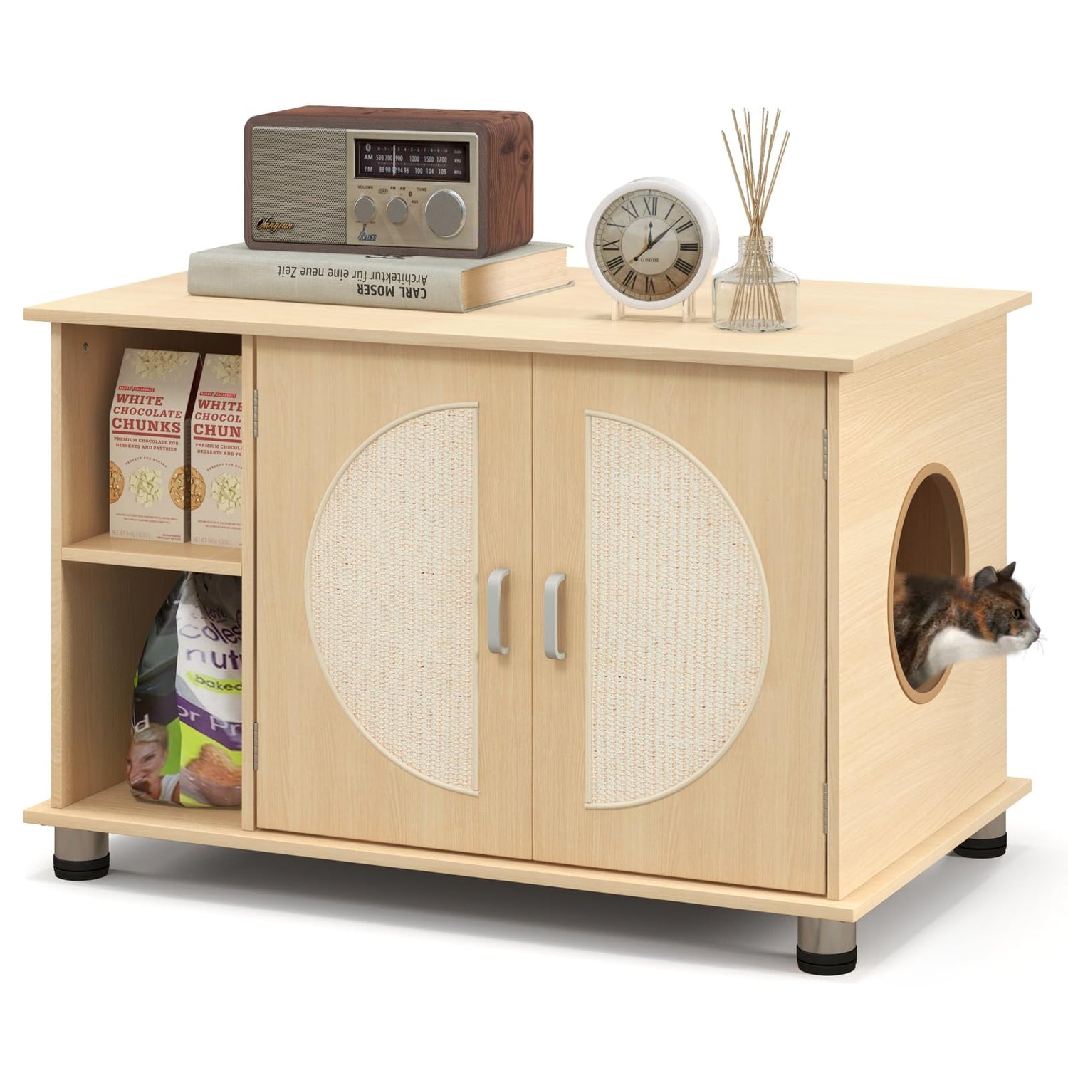 Tangkula Cat Litter Box Enclosure, Hidden Cat Washroom with Storage Shelf, Sisal Scratching Doors, Adjustable Metal Feet, Modern Cat Litter Cabinet Storage Bench, Hidden Litter Box Furniture (Natural)