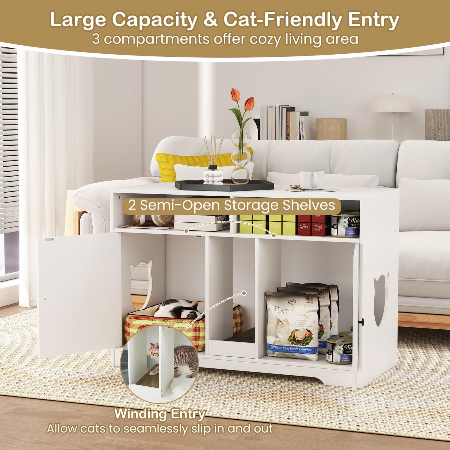 Are you looking for a cat furniture that keeps your home clean and cares for pet privacy? Look no further than this hidden cat litter box enclosure. It not only helps reduce unpleasant smells and minimize litter tracking but also serves as a cozy cat house, litter box enclosure for 2 litter boxes, and a side table for extra storage. The sleek white finish adds a stylish touch to your home decor. Besides, with 3 compartments and 2 semi-open storage shelves, it provides a cozy living area and convenient storage for cat essentials within easy reach. The winding entry and cute cat-shaped entrance allow cats to slip in and out seamlessly. Additionally, equipped with a cat scratching board and wear-resistant sisal scratching mats, this cat enclosure meets your cat’s natural scratching instincts while helping catch splashed litter.