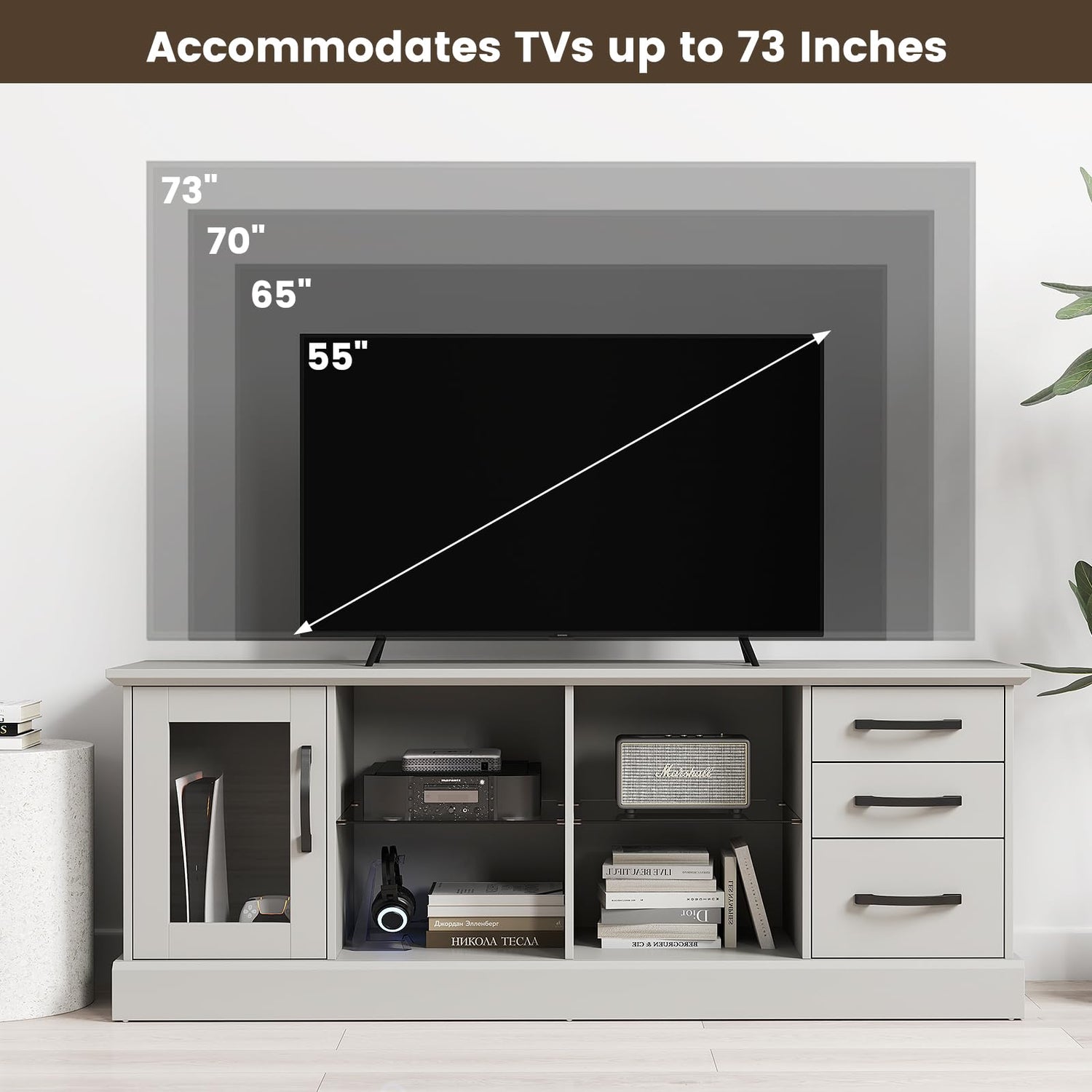 Tangkula Farmhouse TV Stand for 75 Inch TVs, 63” Media Console Table with 3 Drawers, 2 Glass Shelves & Cable Holes, Modern Wooden Entertainment Center for Living Room, Bedroom (Gray)