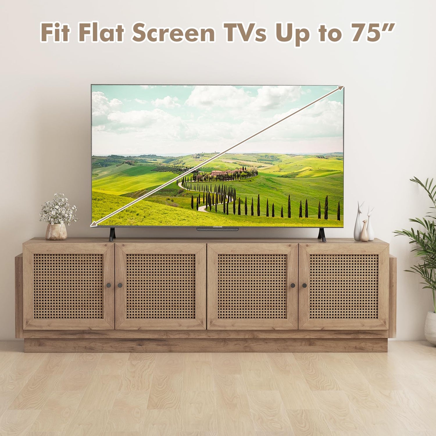 - Elegant PE Rattan Detailing: This TV stand features charming PE rattan fronts on the cabinets, which blends perfectly with both modern and farmhouse decoration, offering a cozy yet elegant appeal.