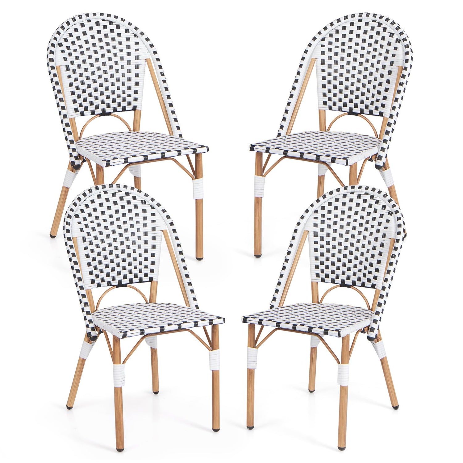 Tangkula French Bistro Chair Set of 4, Outdoor Armless Dining Chairs with Hand-Woven Rattan, Accent Chairs with Galvanized Metal Frame for Garden Kitchen Backyard Porch (Black & White)