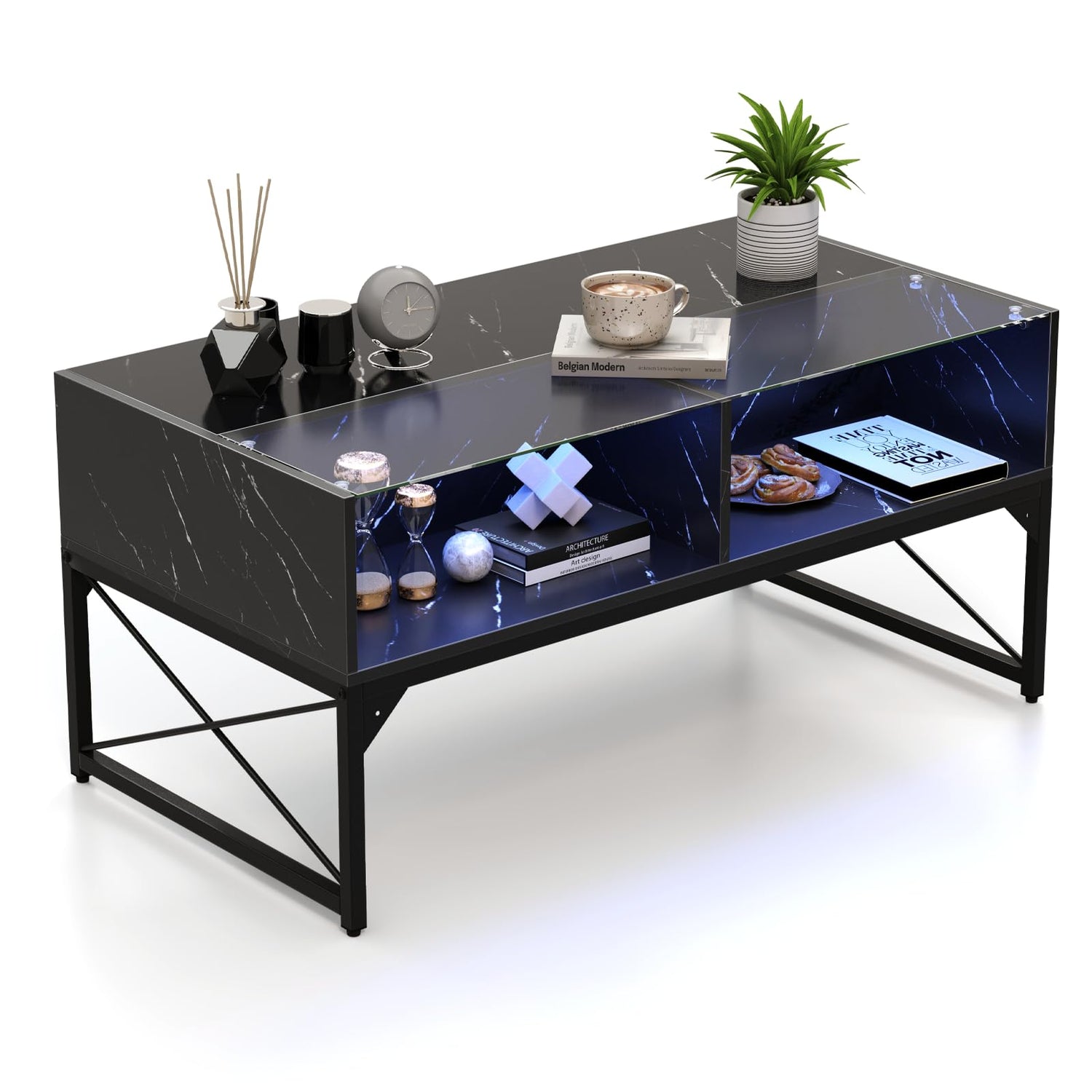 The built-in LED lighting features numerous colors and multiple modes that enhance perfect visual effect and add vibe to your home. Handy remote control is convenient to set the lights on or lights off. Its high-gloss surface, accentuated with a faux marble and tempered glass top, not only adds a touch of elegance but also ensures long-lasting use. For storage convenience, the coffee table features 4 cubes to keep a variety of items in order. Besides, the coffee table is supported by metal tubes, of which the reinforced material can withstand the test of time. All in all, the LED coffee table is compatible with different home styles.