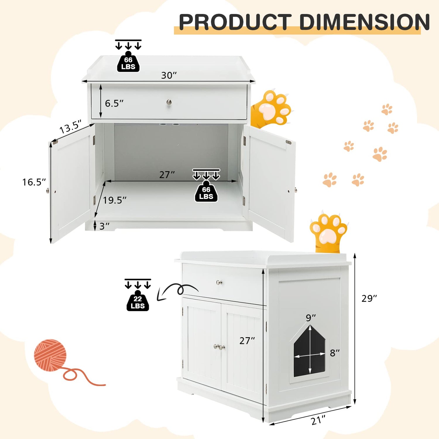 - 【A Deep Drawer & Apron Tabletop:】This cat house is designed with a wide tabletop to place books, magazines, potted plants, lamps, drinking cups, etc. The top apron design protects items from dropping out. The 2-door cabinet accommodates most of the litter boxes, and the deep and wide drawer also provides spacious space for storage.