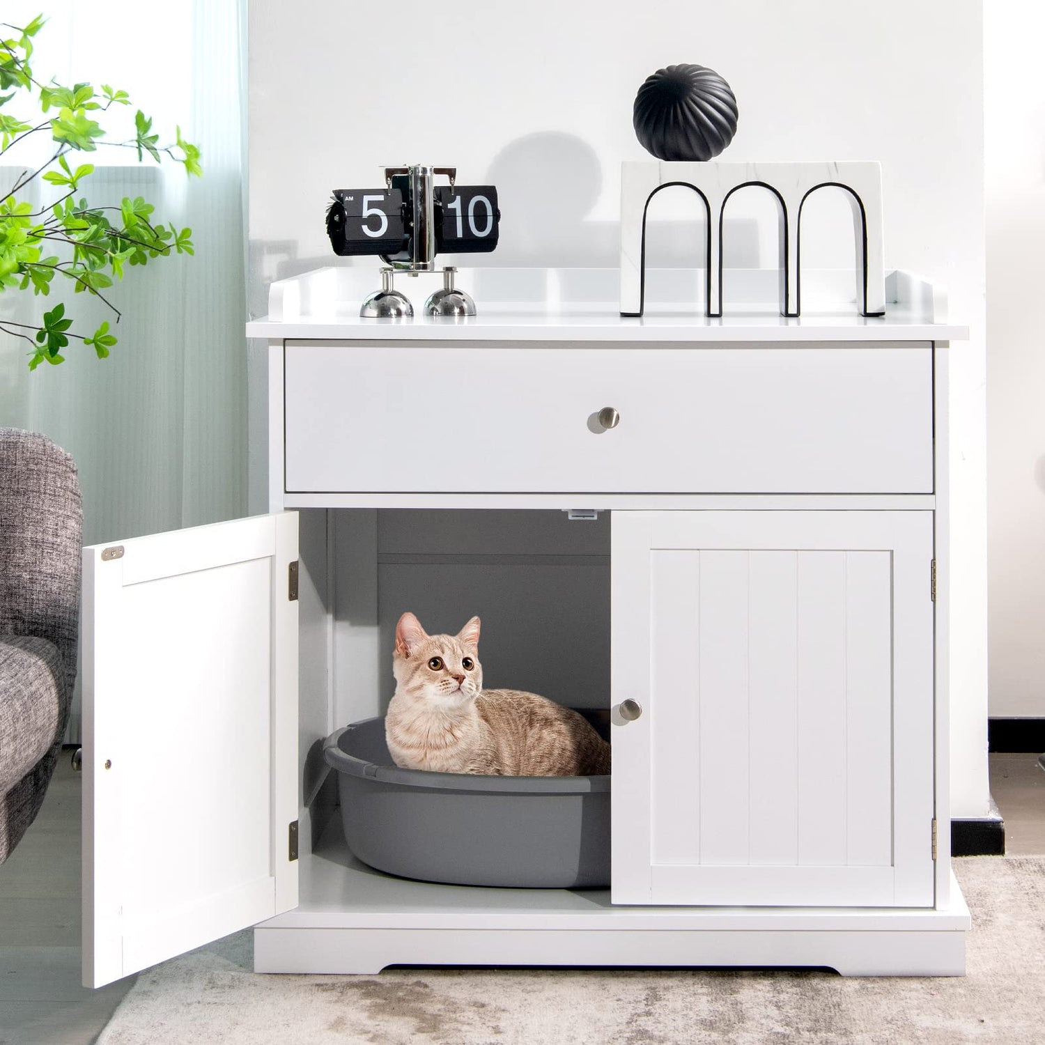 Tangkula Litter Box Enclosure, Cat Litter Box Furniture Hidden with Large Drawer, 2 Doors, Indoor Cat Washroom Storage Bench Side Table Cat House, Large Wooden Enclosed Litter Box Cabinet (White)
