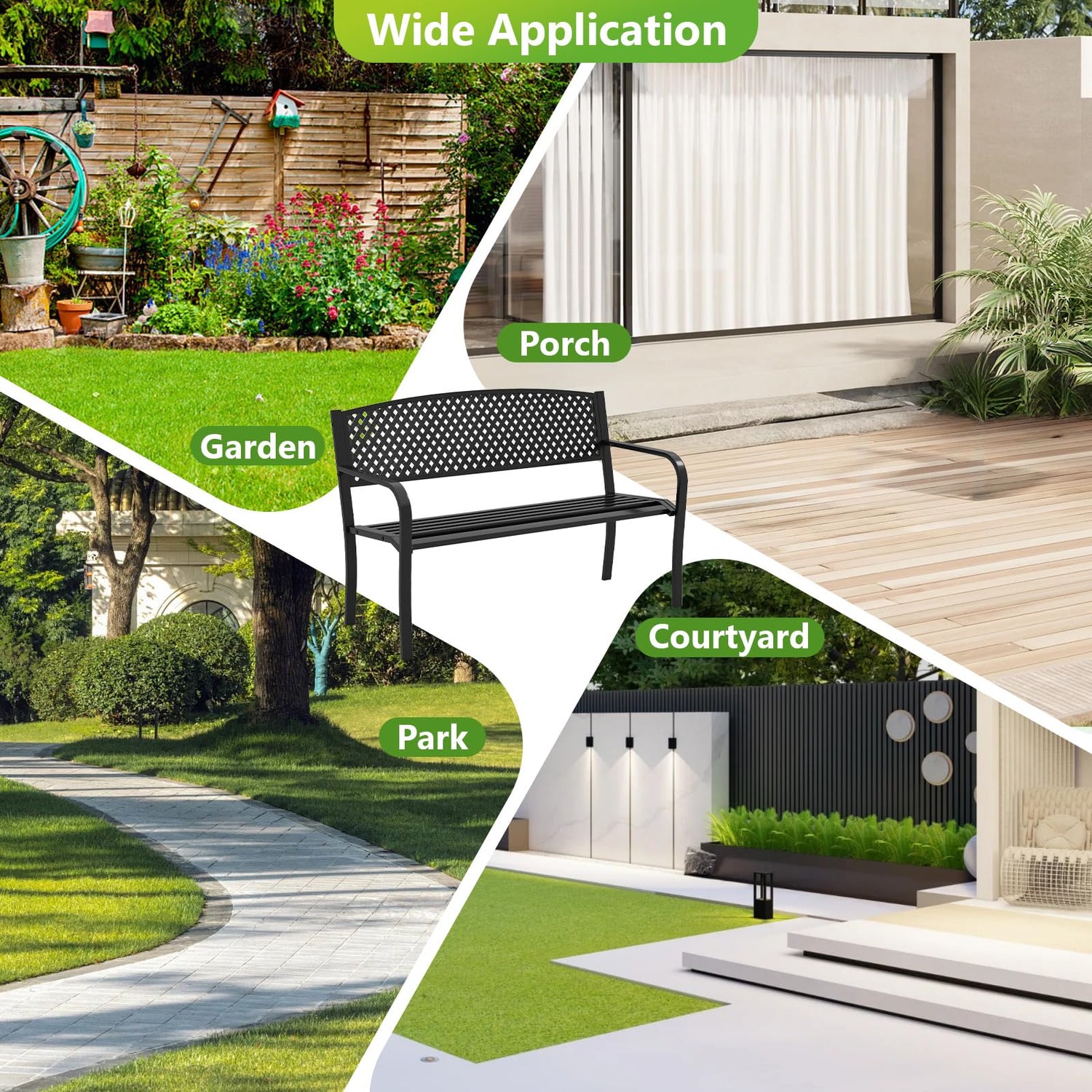 Tangkula Metal Outdoor Park Bench, 50 Inches Garden Bench with Patterned Backrest and Curved Armrests, 2-3-Person Patio Bench, Outside Heavy-Duty Metal Loveseat Chair for Porch, Lawn, Yard & Park
