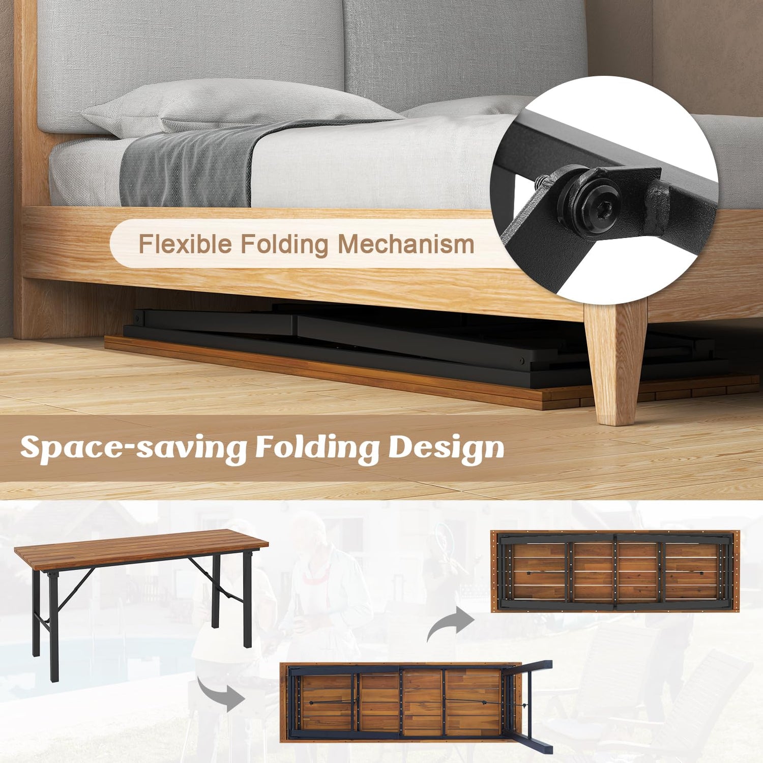 - Convenient Folding Design: Coming with flexible folding mechanism, you can quickly fold and store the patio dining table when not in use, thus optimizing your space utilization or preparing it for transportation. With a folding size of 59” x 20” x 4.5”, the acacia wood table seamlessly fits for narrow corners.