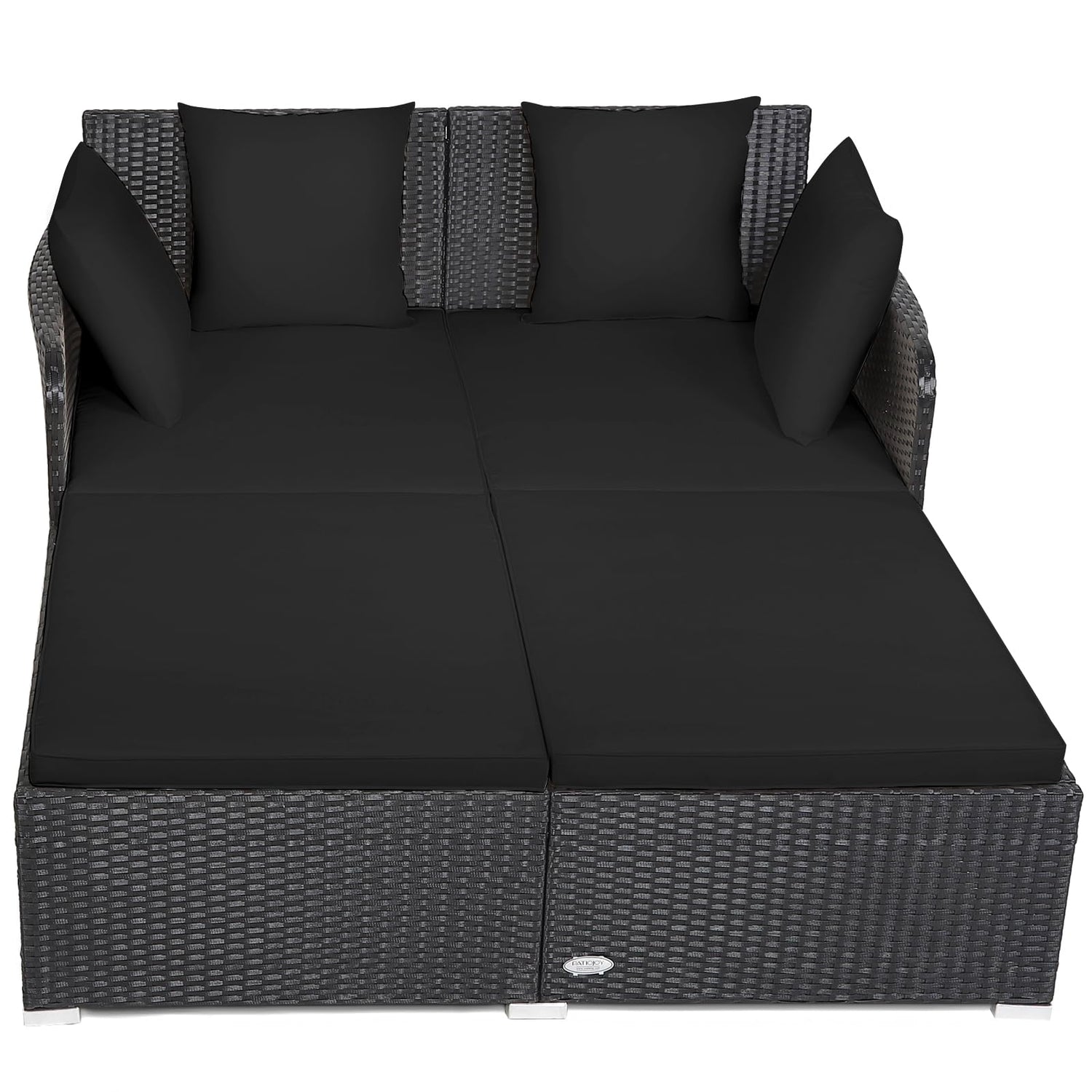 Tangkula Outdoor Rattan Daybed, Wicker Furniture with Spacious Seat, Upholstered Cushion & High-Resilience Sponge, Patio Sofa Set with 4 Pillows, 2-Person Sunbed for Poolside Backyard Garden & Balcony