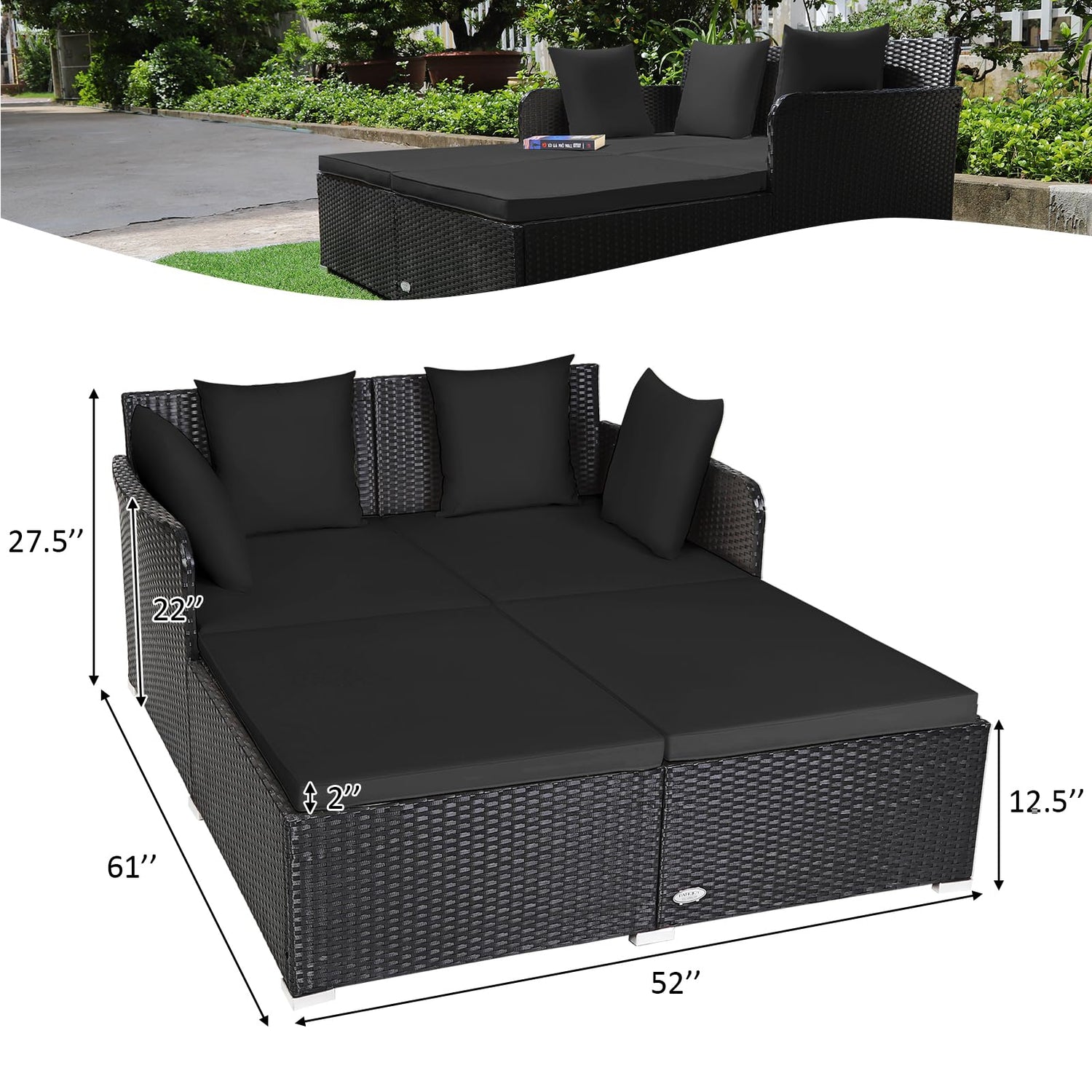 - Spacious Rest Space: Compared to the average lounge chair, this rattan daybed with overall size of 61" x 52" x 27.5" (L x W x H) is roomy enough to be friendly for people who are heavy or tall without any discomfort of crowding. This rattan sofa bed even allows you to chat with your best friends while lying down and enjoying the leisure time.