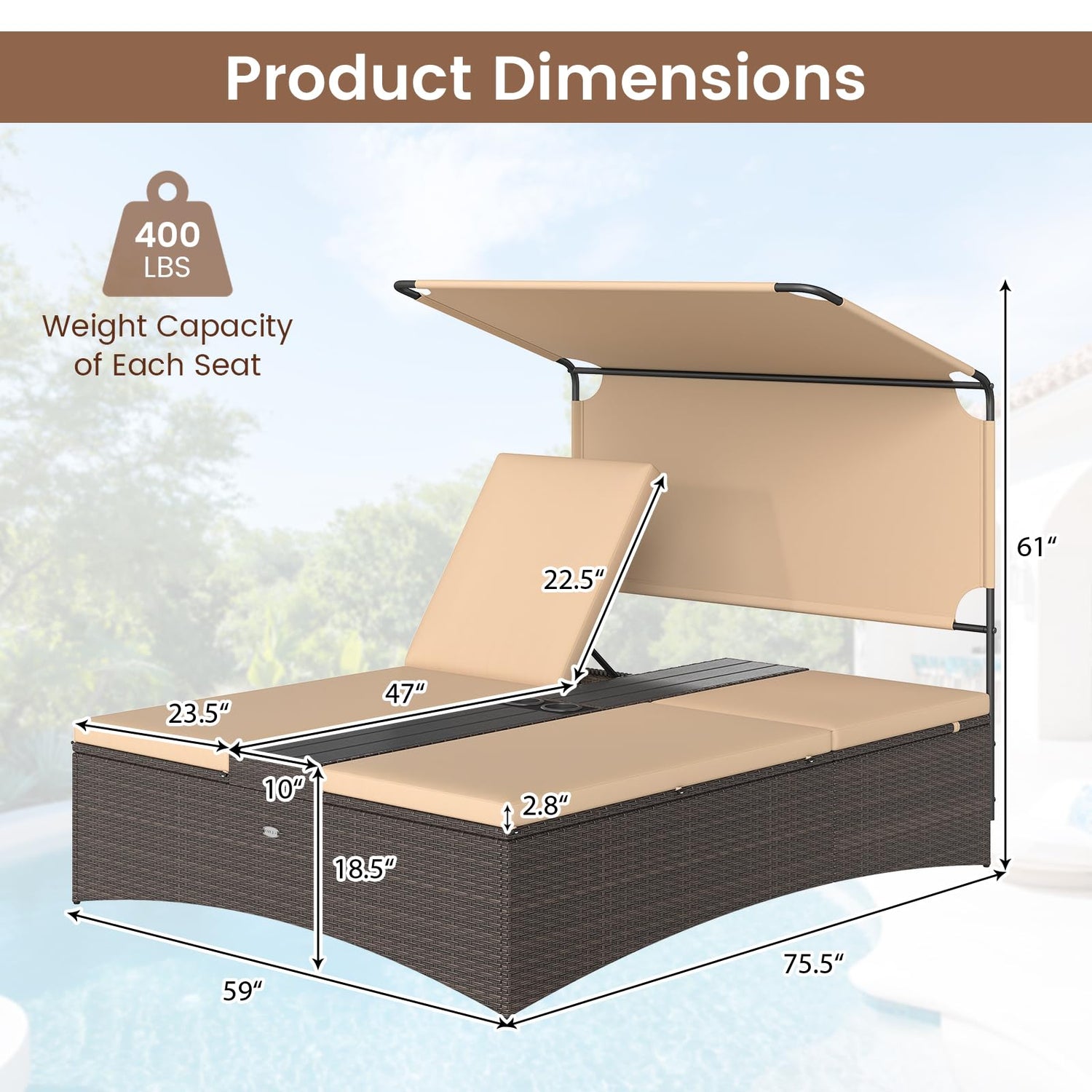 - Your Comfort Does Matter: The patio chaise lounge bed comes with a canopy to bring you the right amount of shade. Filled with high-resilience sponge for comfort, the full-length cushions stay in place thanks to their toggle fasteners. When it comes to cleaning, the smooth zippers on the cushion covers help a lot.
