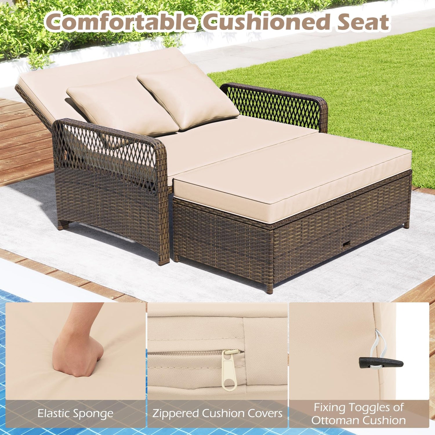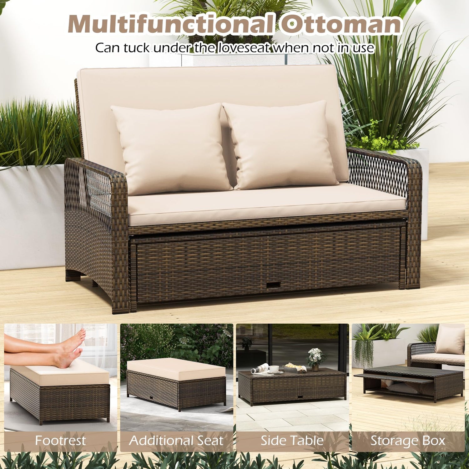 Tangkula Patio Adjustable Wicker Daybed, Rattan Loveseat & Storage Ottoman w/ 4-Level Backrest & Soft Cushions, Space-Saving 2-Person Sun Lounger for Backyard, Porch (Beige)
