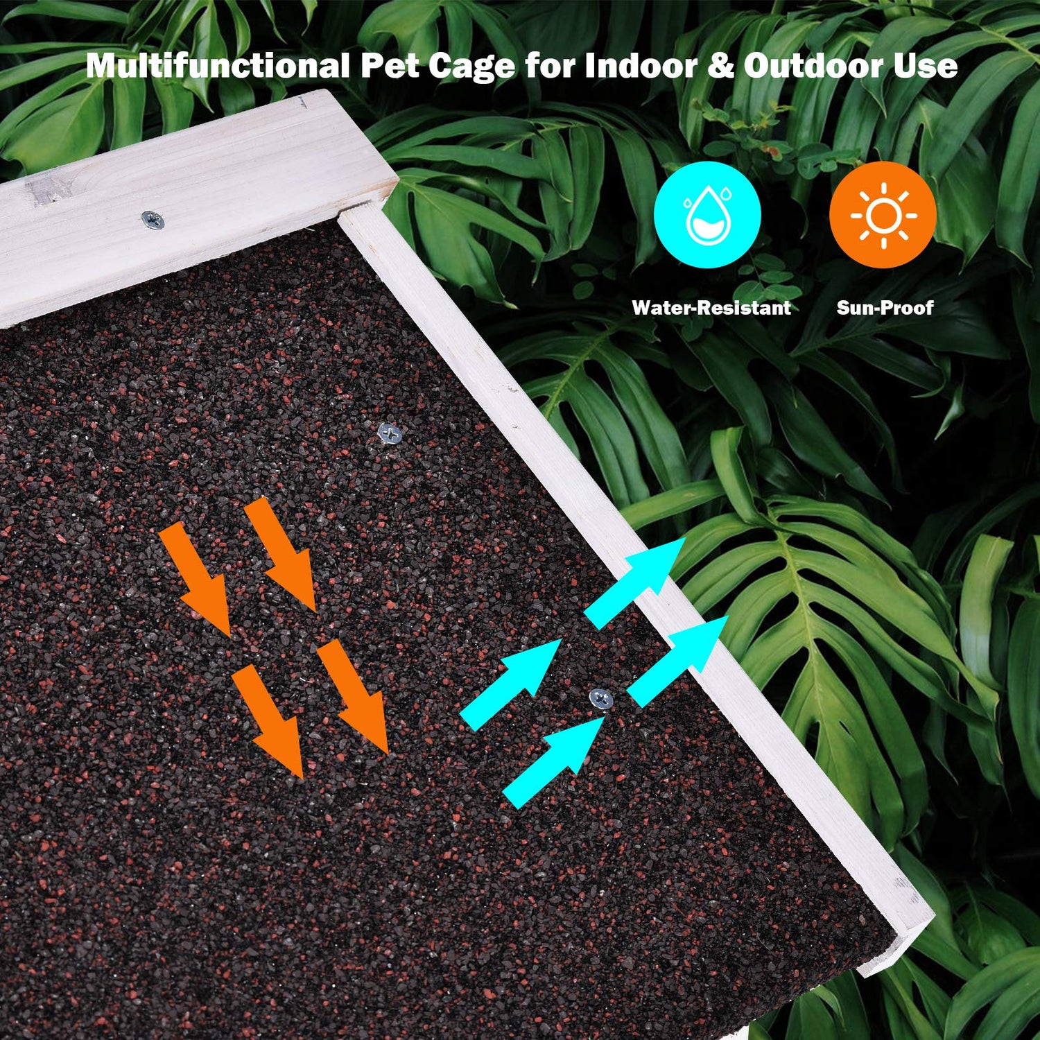 - Weatherproof Asphalt Roof: Fully covered with high-quality asphalt, the rabbit cage’s roof is waterproof and sun-resistant, making the cage an ideal shelter for your pets from rain and direct sunlight. As the wood frame is also rain-resistant, you can put it outdoors with no worry about the weather.