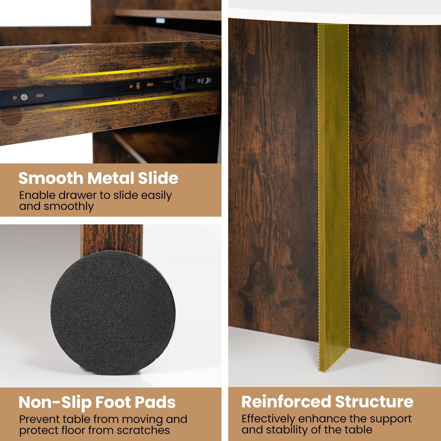 Ideal for clothing stores, tea shops, beauty shops, and reception areas, this desk features an oval desktop that offers ample workspace and storage solutions, adding a touch of modern elegance. It includes an L-shaped corner shelf that provides privacy and a more intimate workspace, perfect for handling sensitive information. Additionally, the lockable storage drawer, equipped with two keys, ensures the security of personal items and confidential documents. Stay organized with a spacious shelf that makes office supplies easily accessible along with a 2-tier open shelf with five adjustable positions to adapt to your storage needs, such as notes, paper folder, shopping bags. The desk is built with smooth metal slides to facilitate easy drawer operation. Elevate your environment today with a touch of class and unparalleled functionality!