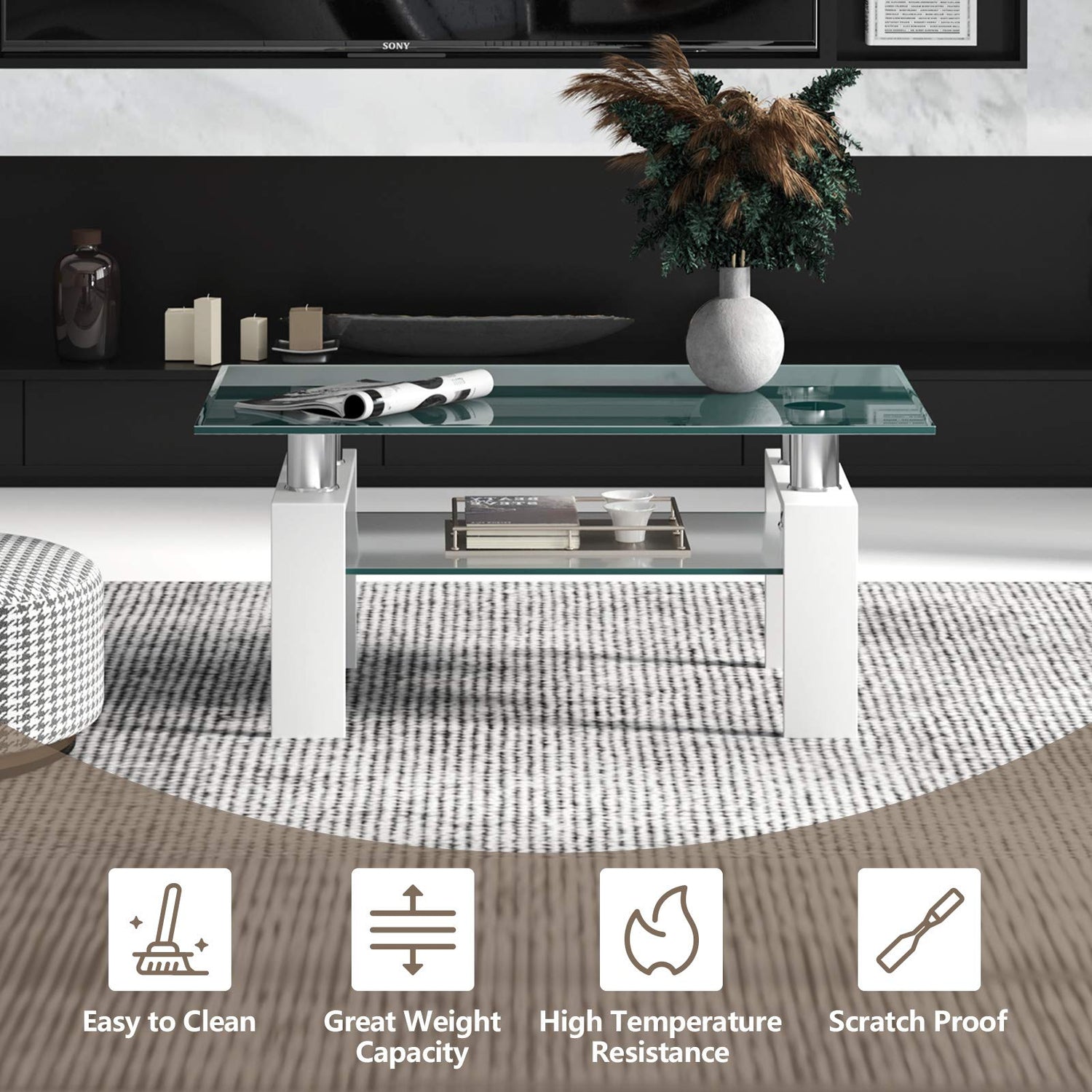- Premium Material& Sturdy Structure: The transparent tempered glass tabletop and frosted glass shelf make the coffee table have better heat resistance and impact resistance than ordinary glass. The tabletop can bear a maximum weight of 286 lbs and the shelf weight capacity is 110 lbs. The coated iron legs provide you with long-term service.