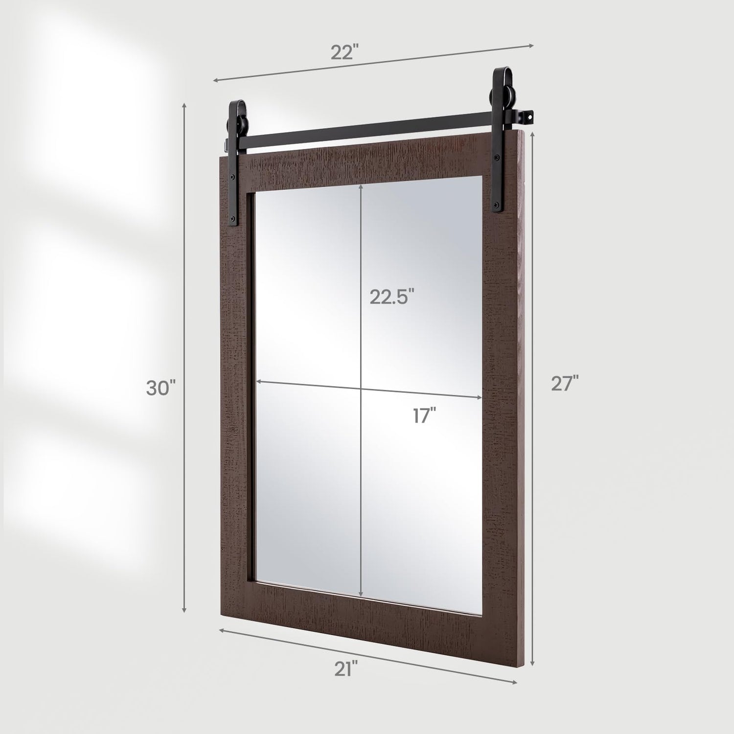- ๐๐๐ง๐จ๐๐ฉ๐๐ก๐ ๐ฟ๐๐๐ค๐ง: With its ideal dimensions of 22" x 30" (W x L), this barn door-style mirror fits seamlessly into various spacesโwhether itโs your living room, bathroom, or entrance hall. Its timeless design complements any indoor decor, adding a stylish focal point wherever itโs placed.