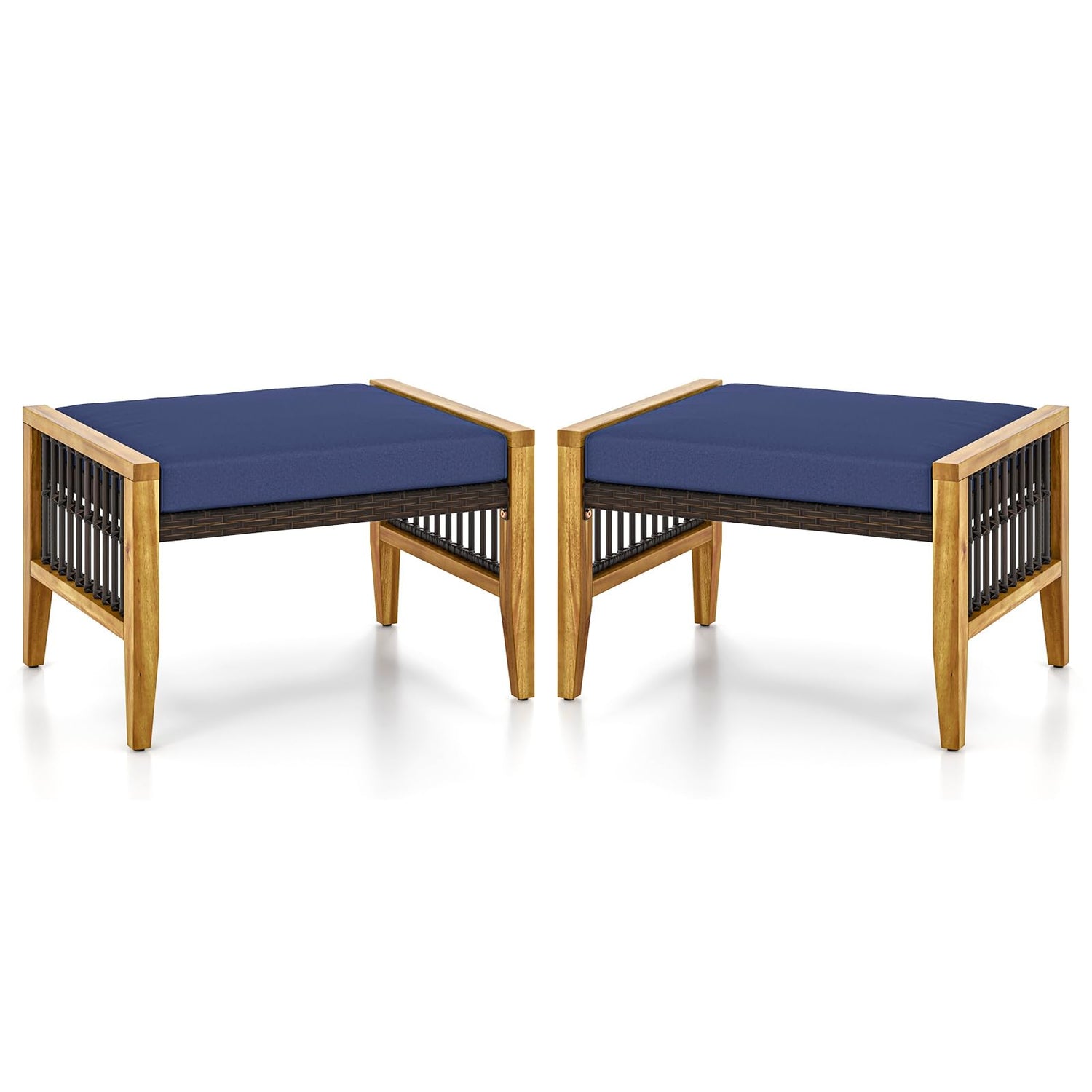 Tangkula Set of 2 Outdoor Ottomans, Patio Acacia Wood Ottomans with Cushions, Versatile Rattan Woven Footstools, Wicker Footrest Extra Seating for Backyard, Poolside, Porch