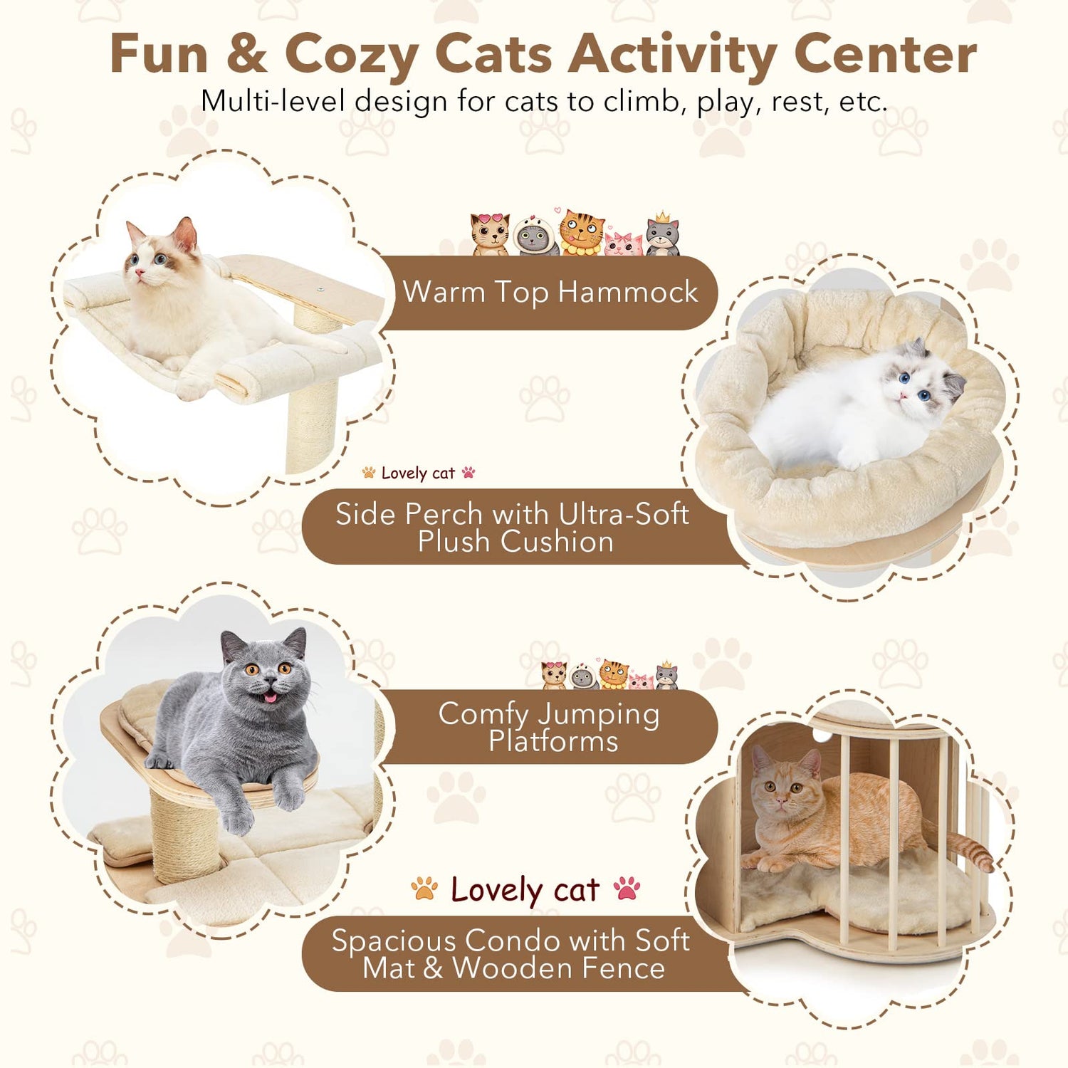 - 【Fun & Cozy Cats Activity Center:】This 55" tall cat tree features a warm top hammock, side perch with ultra-soft plush cushion, comfy jumping platforms and spacious condo with soft mat & wooden fence, offering large space for your cats to rest, eat and play.