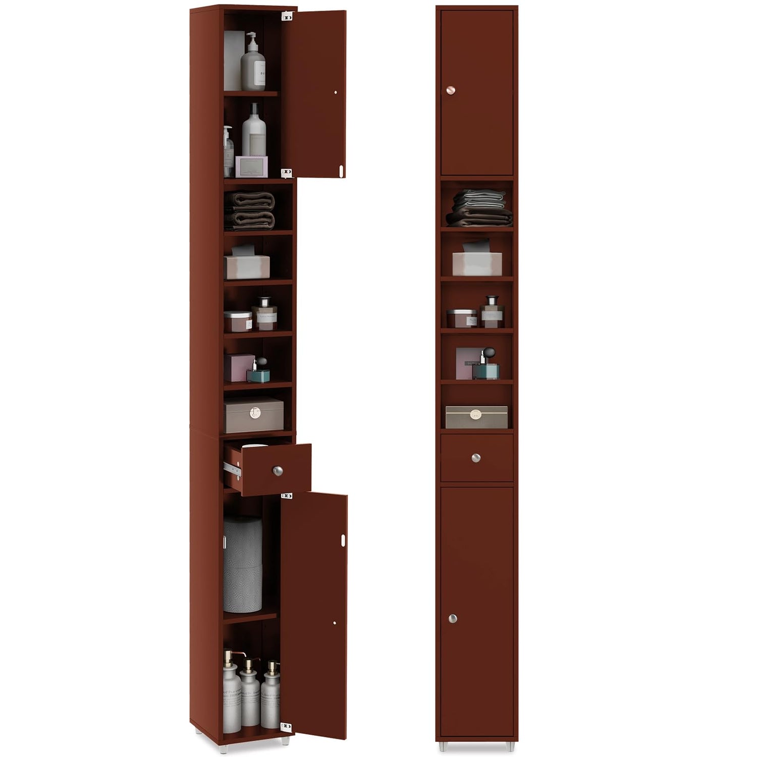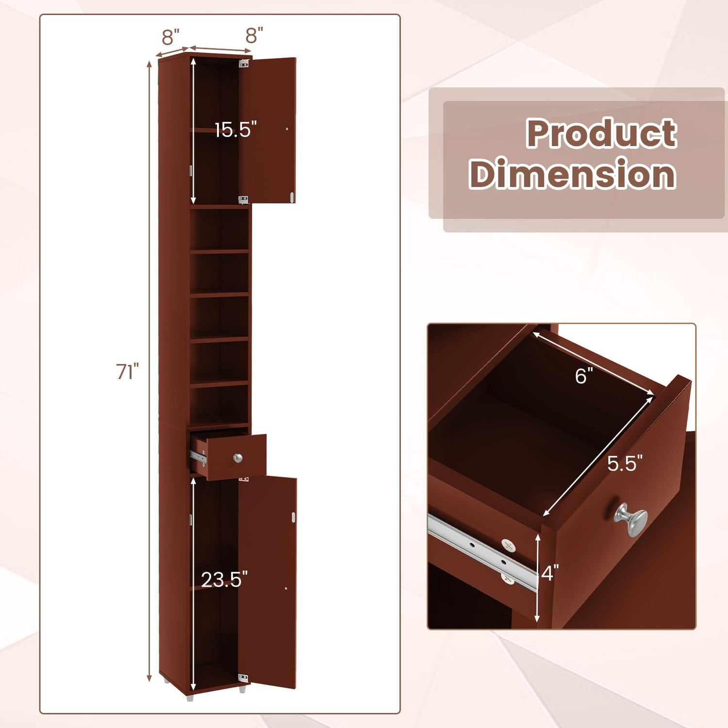 Tangkula Tall Slim Bathroom Storage Cabinet, 71" Freestanding Bathroom Cabinet w/ 2 Doors, 1 Drawer & 5 Adjustable Shelves, Floor Narrow Tower Cabinet for Small Spaces, 8" x 8" x 71" (Brown)