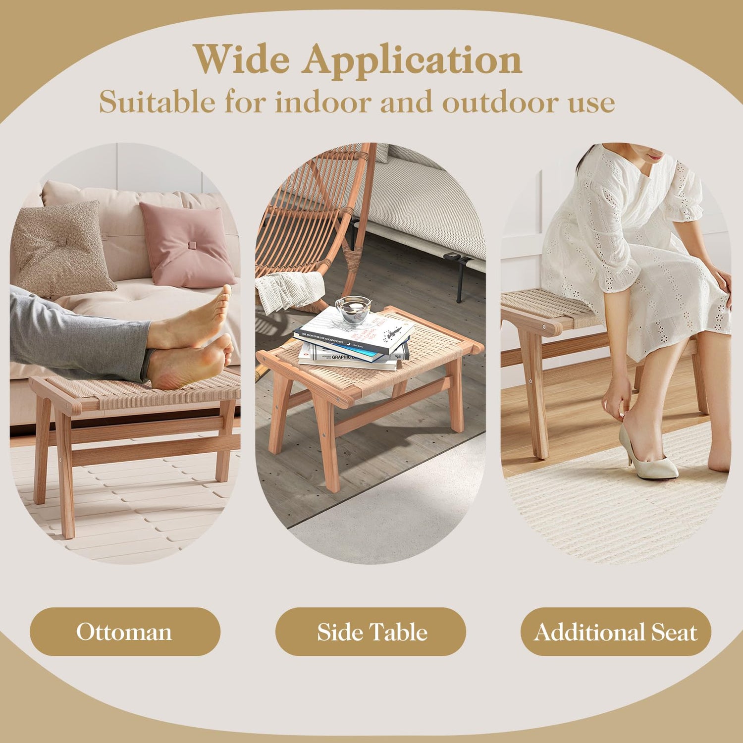 - Braided Rope Design: The braided rope surface of this wooden foot rest ensures good breathability in hot days, providing both comfort and style to your decoration. Note: This ottoman should not be exposed to rain and is not suitable for outdoor use.