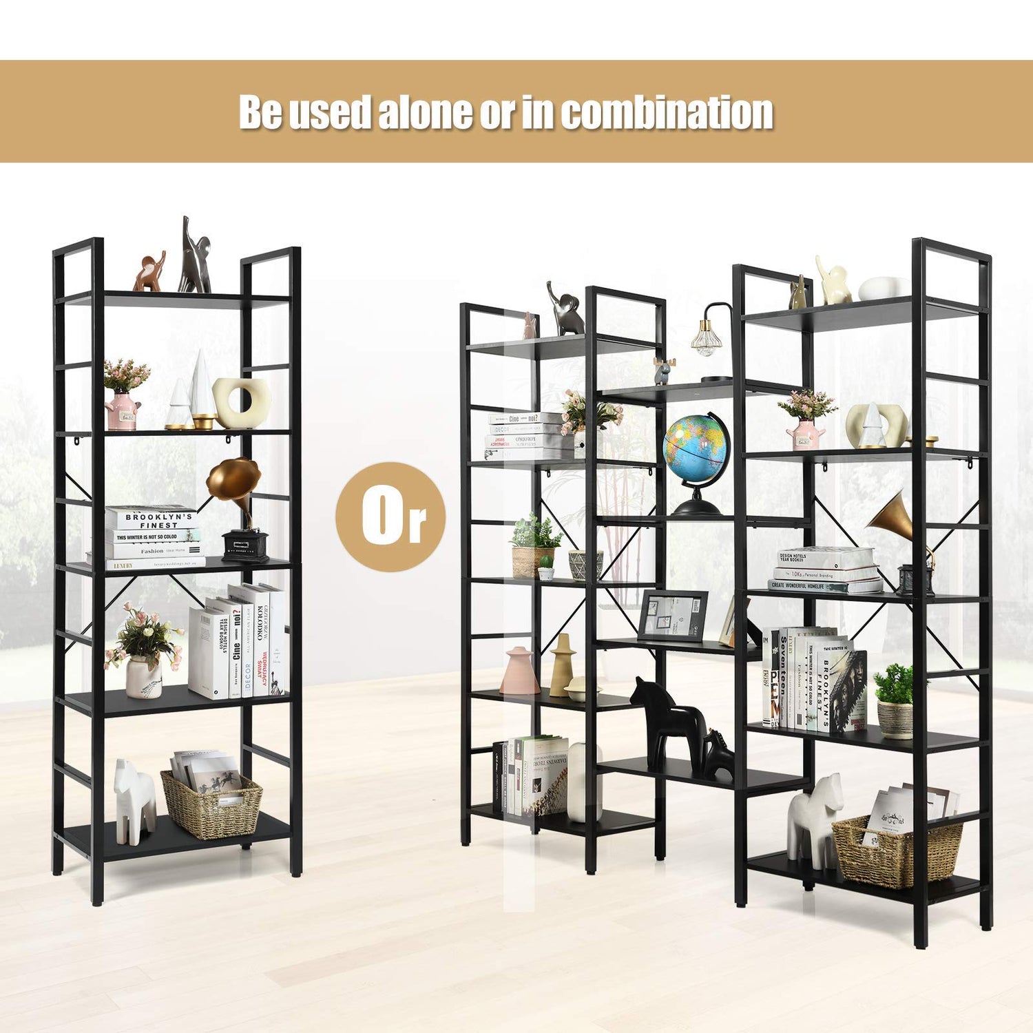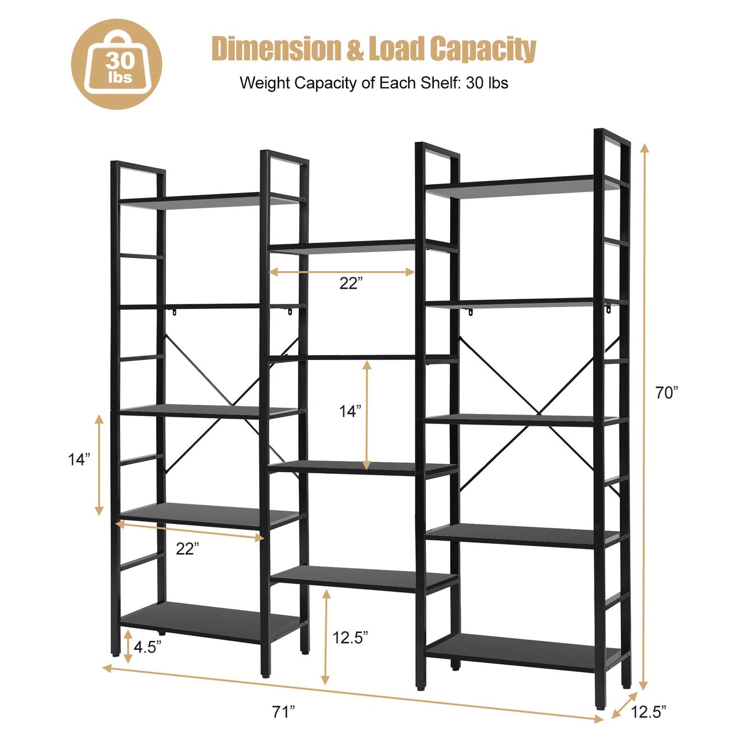 Tangkula Triple Wide 5-Tier Bookcase, Large Open Bookshelf, Display & Storage Shelf, Vintage Industrial Style Shelves with Metal Frame, Bookcase Furniture for Living Room, Study, Office (Black)
