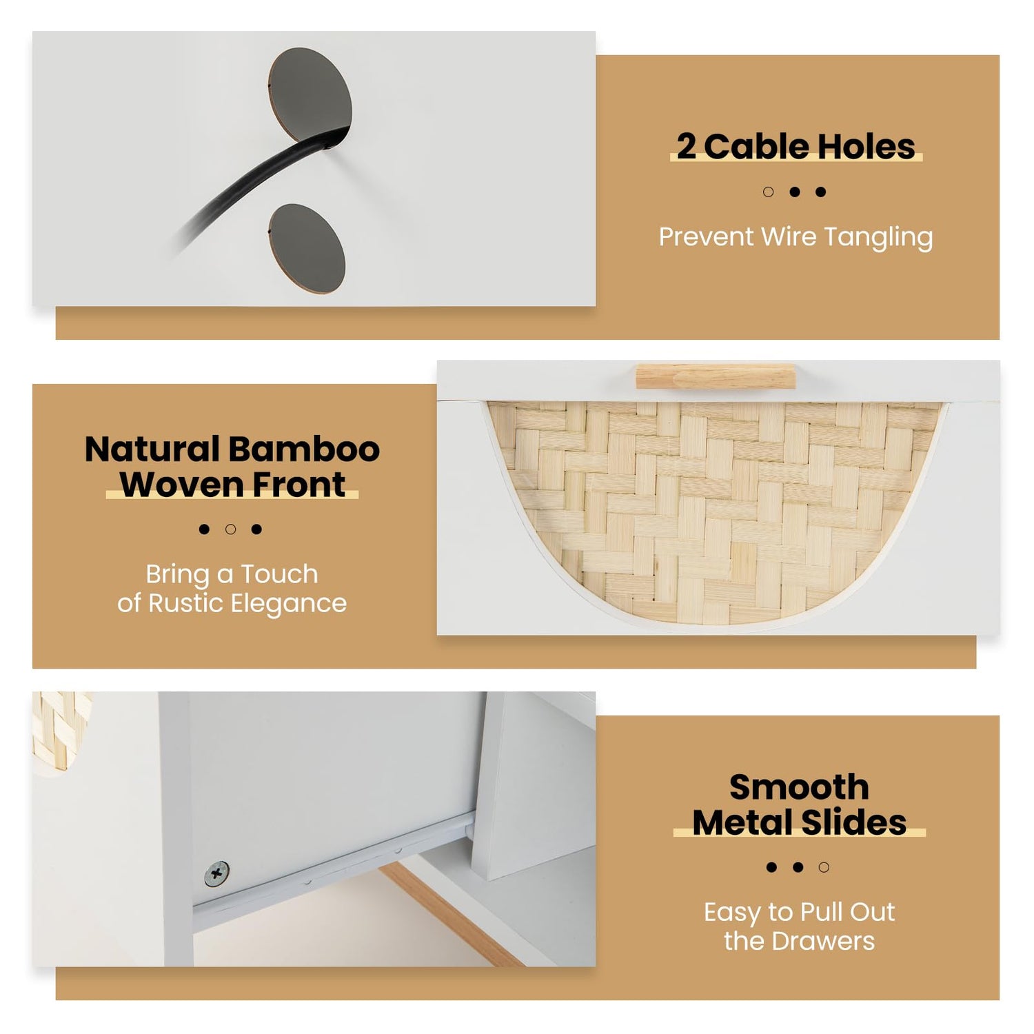 - Mid-century Modern Flair: Elevate your living space with our mid-century modern TV stand! Its clean white finish and timeless bamboo-woven drawer fronts blend effortlessly with a variety of decoration styles, offering both sophistication and functionality.