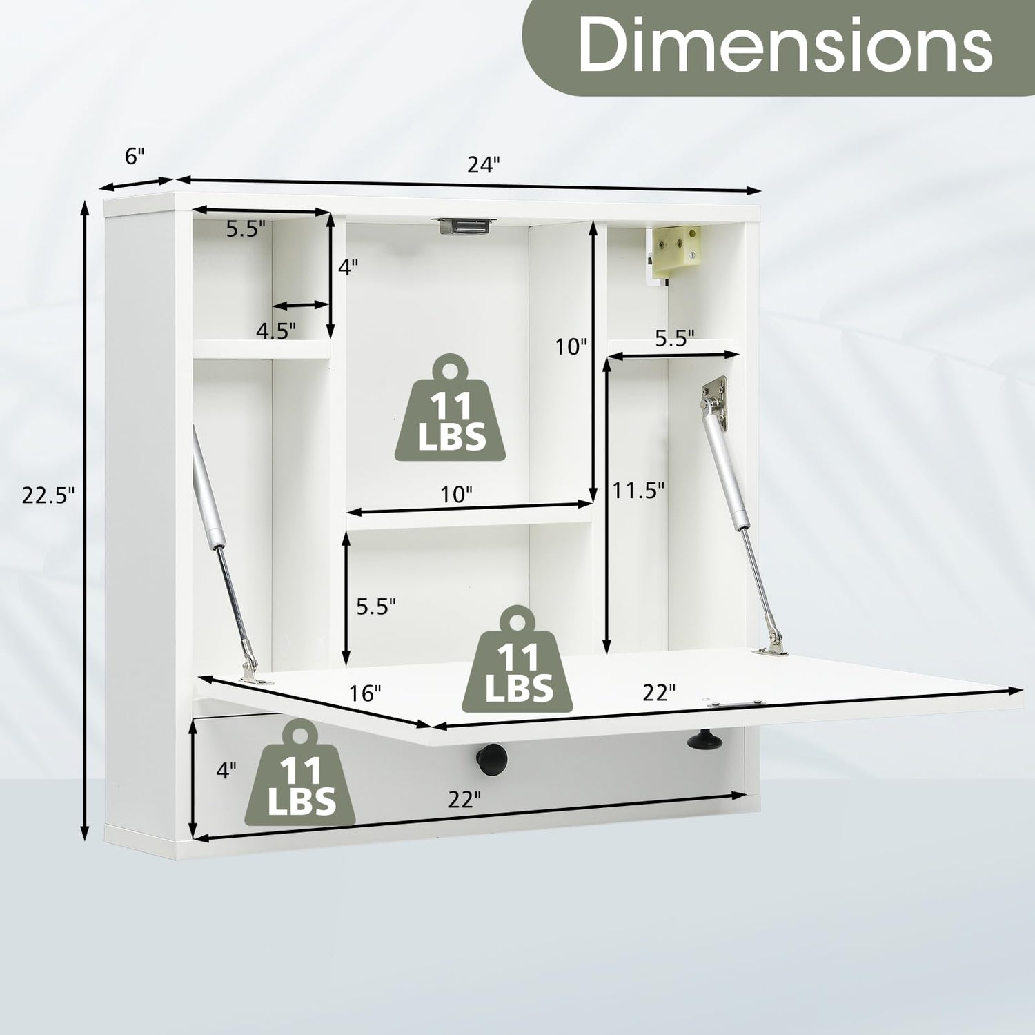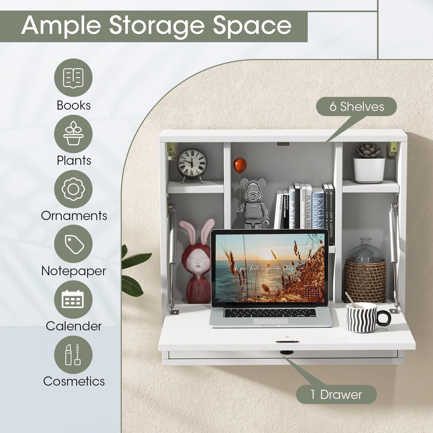 Tangkula Wall Mounted Desk, Folding Wall Table Floating Desk Wall Mount Laptop Desk, Space Saving Wall Mounted Table Wall Desk with Storage Drawer & Shelves (White)