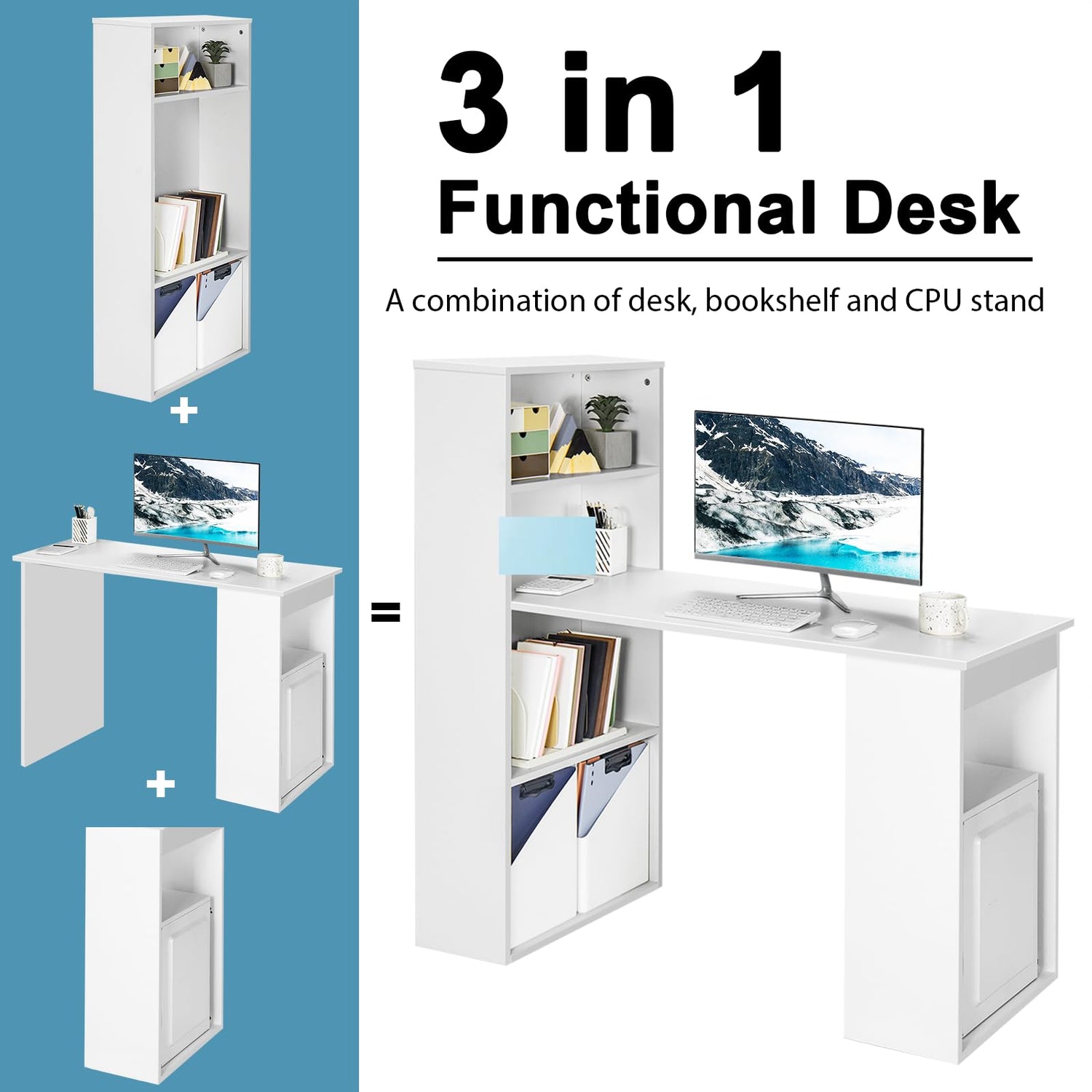 Tangkula White Computer Desk with Bookshelf, Writing Study Desk with Storage Shelves & CPU Stand, Modern Compact Computer Workstation for Home & Office, Space-Saving Design